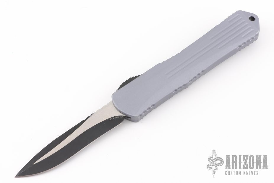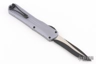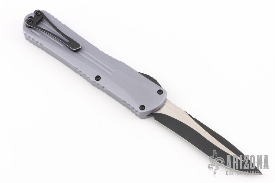 This Manticore-X by Heretic Knives features a two-tone black finished blade with notched thumbrest. The handle has a gray aluminum frame with black stainless steel hardware, tip down clip, and thumbslide. Comes with original box. S/N 03362. Has some minor wear on the clip and a couple light scuffs, otherwise excellent condition.