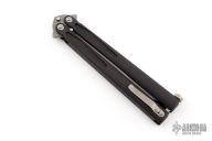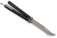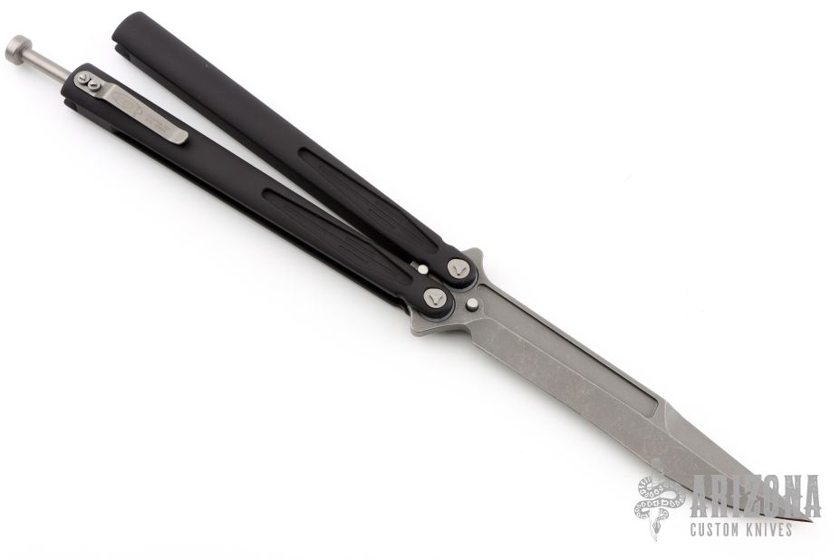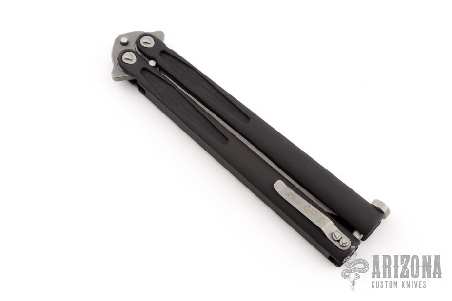 This Tachyon III balisong by Microtech Knives has a Apycalyptic finished blade with false top edge. The handles are integral black finished aluminum with spring latch and tip up stainless steel clip. Includes original box and tool. Dated 09/2016, s/n 00866. Excellent condition.