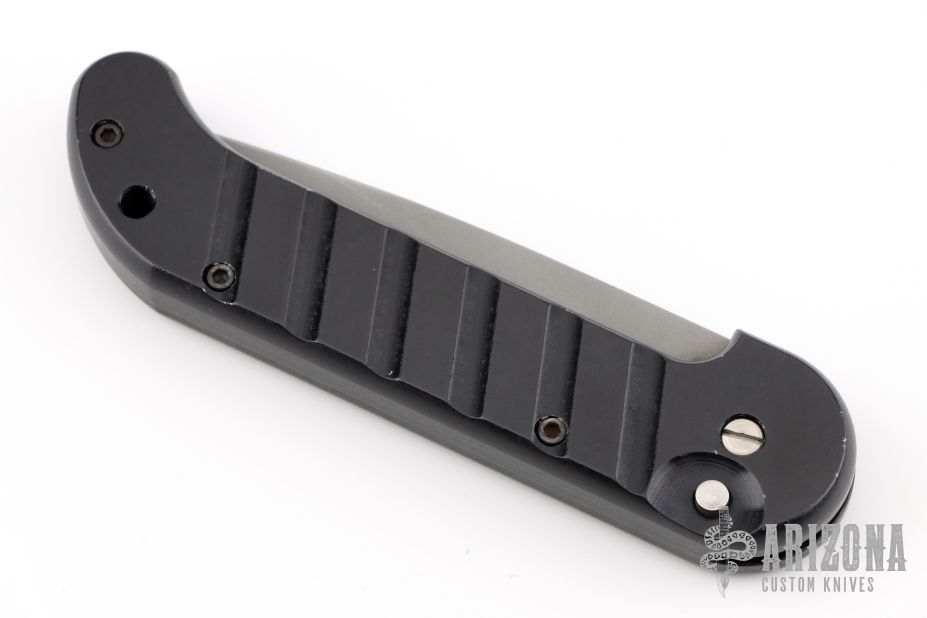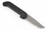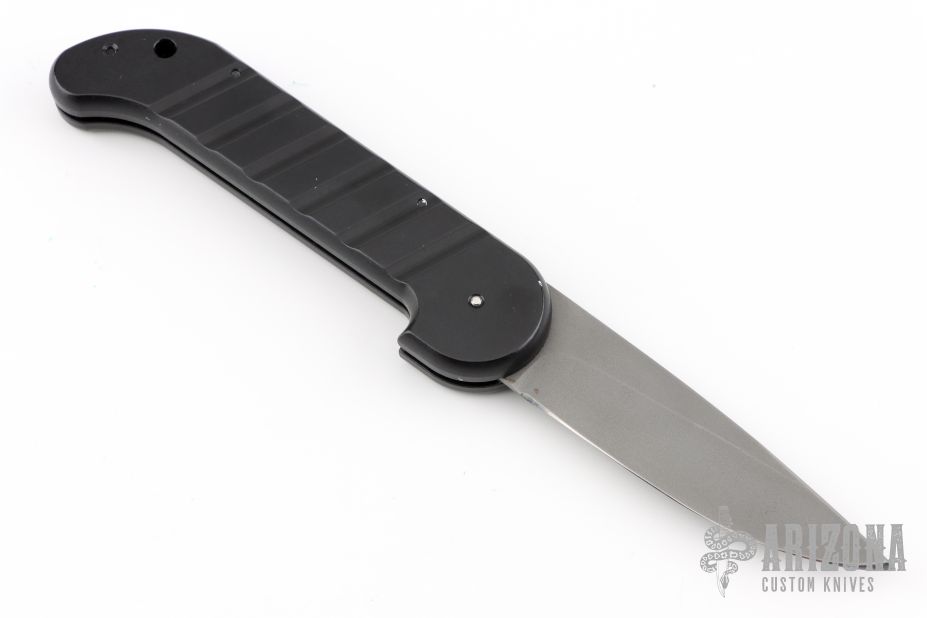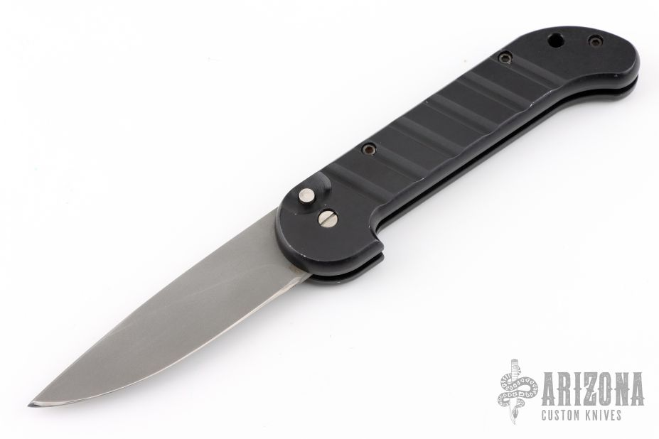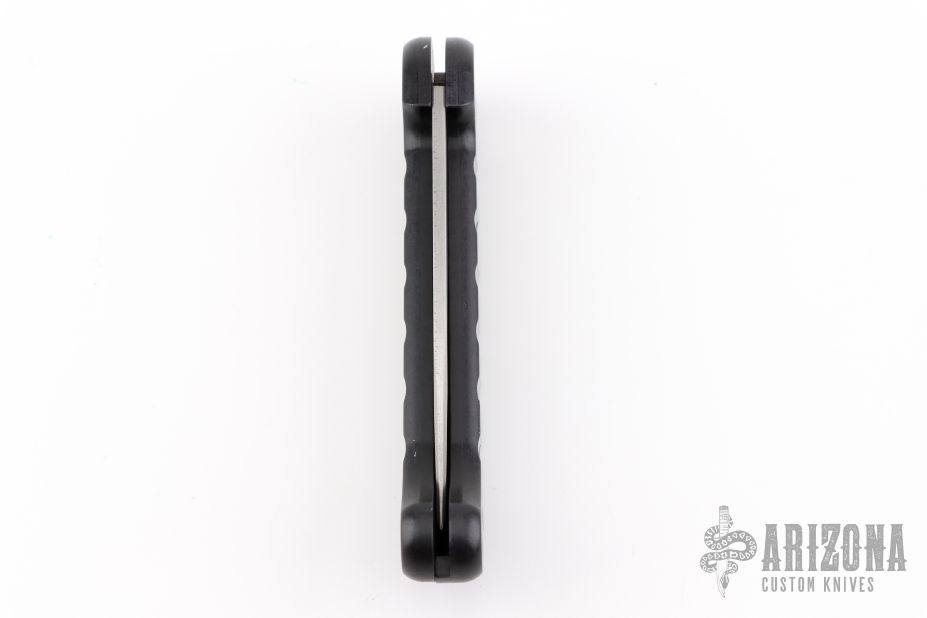 This Sterile Black Knife by features a spear point bead blasted blade with false top edge. The handle has a black aluminum frame with lanyard hole. Strong action. Has a couple light scuffs, excellent condition otherwise.