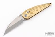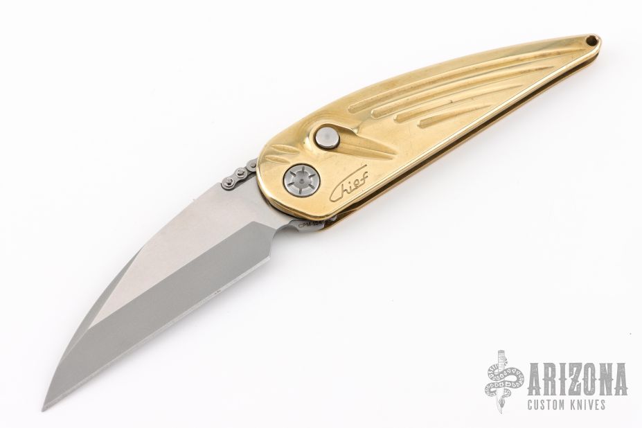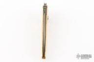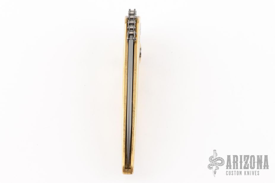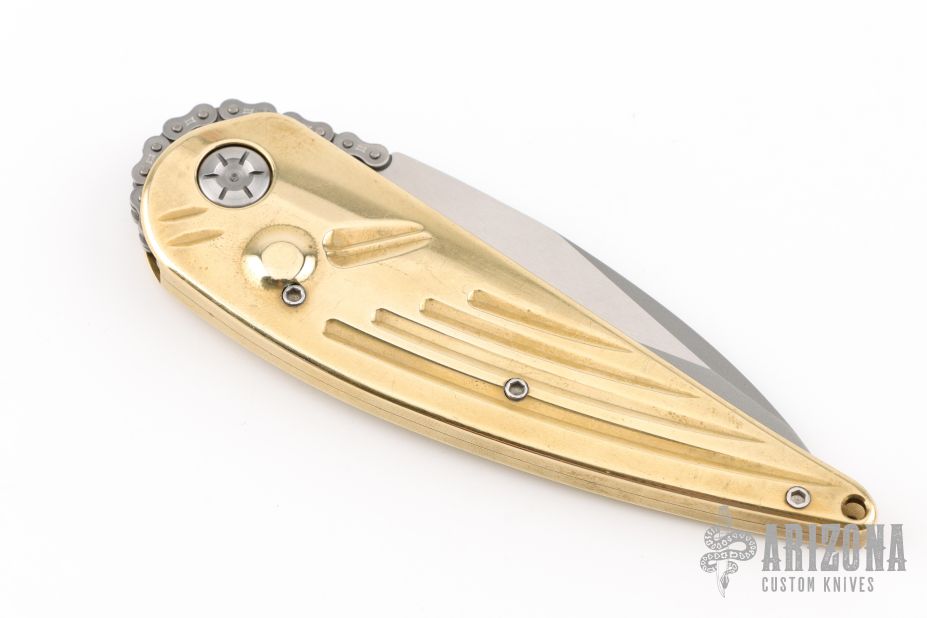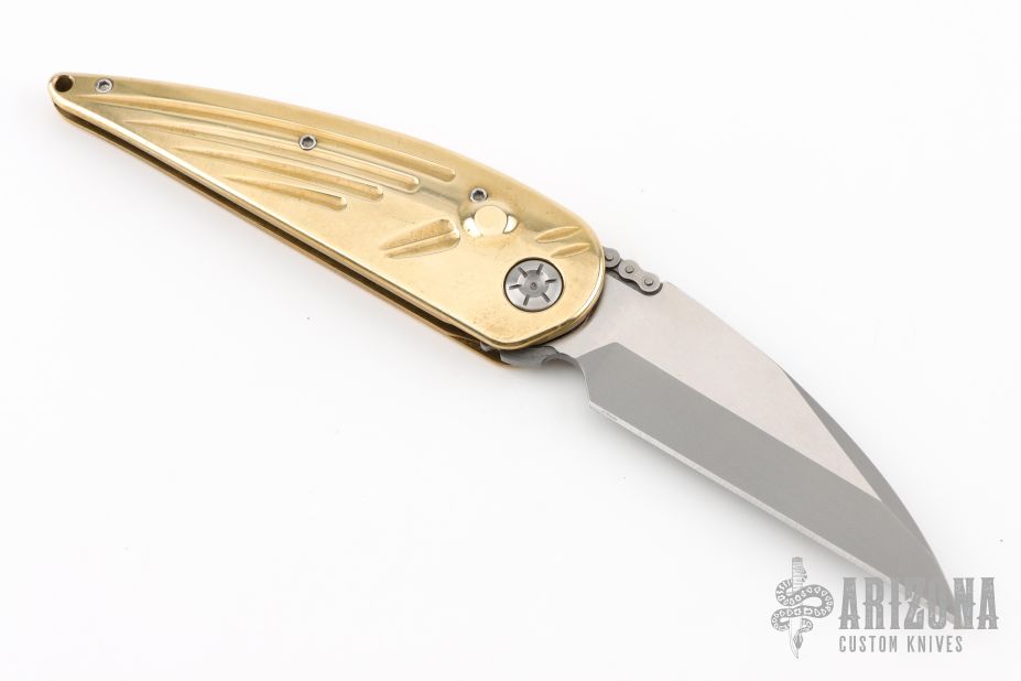 This MRX by Rat Worx features a satin finished razor style blade. The handle is satin brass with a chain drive opening mechanism. Comes with a zipper case. Has some light scuffs and scratches on the frame, otherwise excellent condition.