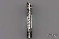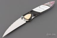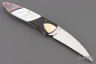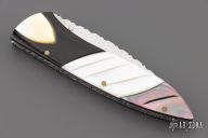 This knife by DC Customs features a mirror polished blade with a single thumbstud with abalone inlay and fileworked blade spine. The handle has buffalo horn bolsters with gold lip pearl inlays, fluted mother of pearl and black lip pearl scales, fileworked stainless steel liners and backspacer. Nice detent, lockup and blade seating. Has a couple very light scratches, otherwise excellent condition.