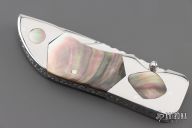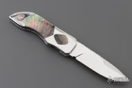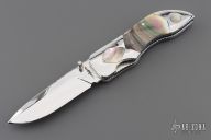 This knife by DC Customs features a mirror polished blade with a single thumbstud with and fileworked blade spine. The handle has stainless steel bolsters with black lip pearl inlays, black lip pearl scales, fileworked stainless steel liners and backspacer. Nice detent and blade seating. Has a couple very light scratches, otherwise excellent condition.