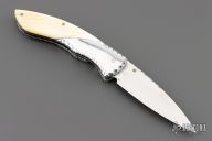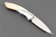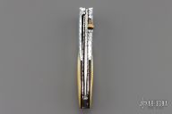 This knife by DC Customs features a mirror polished blade with a single brass thumbstud with and fileworked blade spine. The handle has fileworked aluminum bolsters, gold lip pearl scales, fileworked stainless steel liners and backspacer. Nice detent, lockup and blade seating. Has a couple very light scratches, otherwise excellent condition.