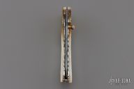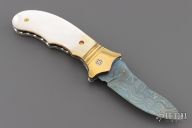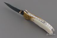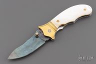 This knife by DC Customs features a Blued Damascus blade with a single brass thumbstud with mother of pearl inlays and notched blade spine. The handle has fluted brass bolsters, mother of pearl scales, fileworked stainless steel liners and backspacer. Nice detent, lockup and blade seating. Has a couple very light scratches, otherwise excellent condition.