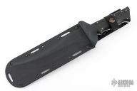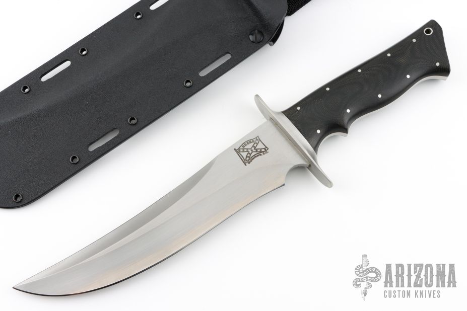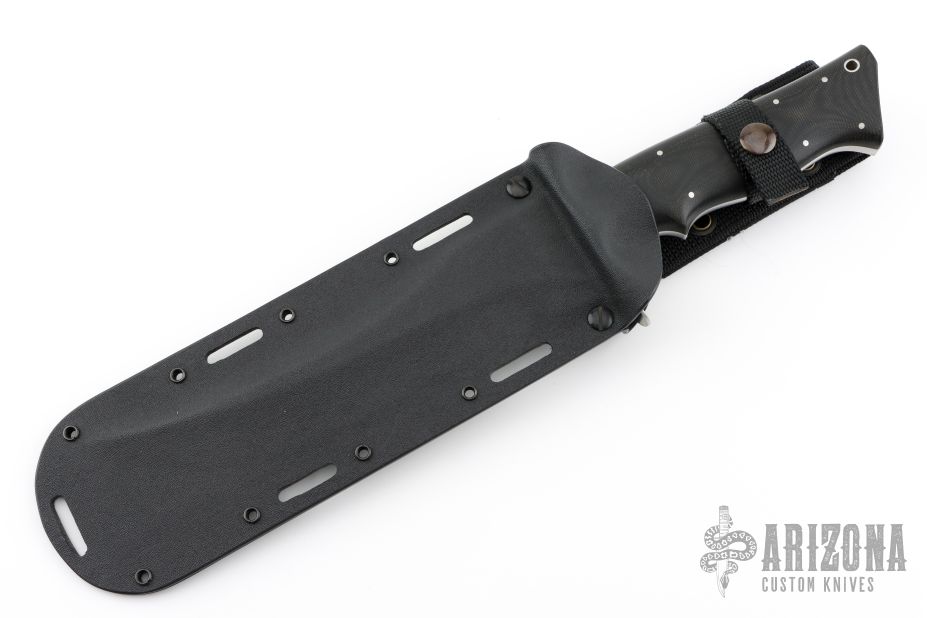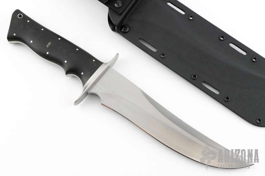 This Model 5 by Walter Brend features a two tone recurve blade with mirror polished grinds and satin finished flats, sharpened top edge, .244" blade stock and 1.878" blade depth, full tang construction. The handle has a titanium guard with black canvas micarta scales. Waterboro SC production from the mid-nineties. Comes with a black Kydex/nylon belt sheath. Excellent condition.