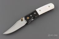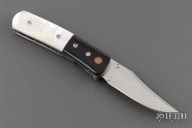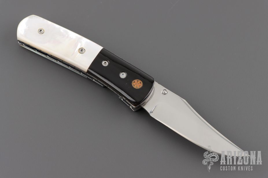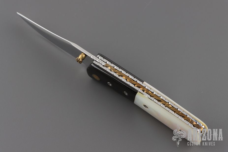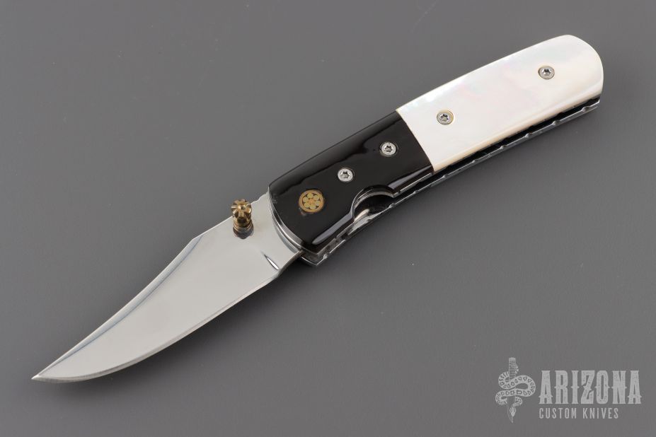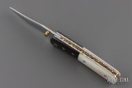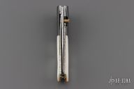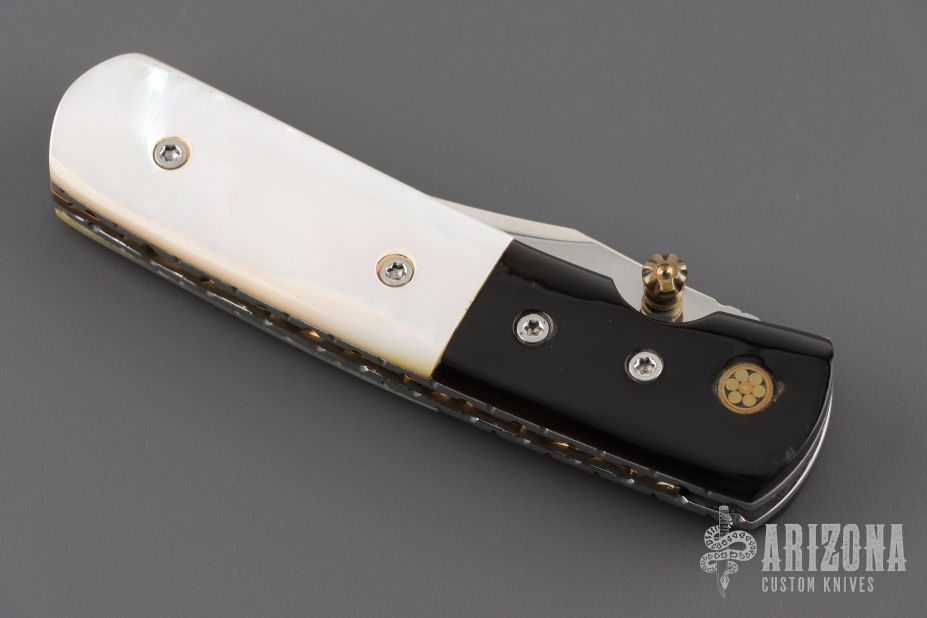 This knife by Master of Knife features a mirror finished blade with a single brass thumbstud and fileworked blade spine. The handle has buffalo horn bolsters, mother of pearl scales, fileworked stainless steel liners and a fileworked and anodized titanium backspacer. Nice blade seating and lockup. Has a couple very light scratches, otherwise excellent condition.