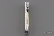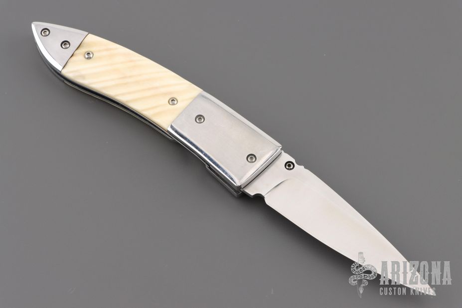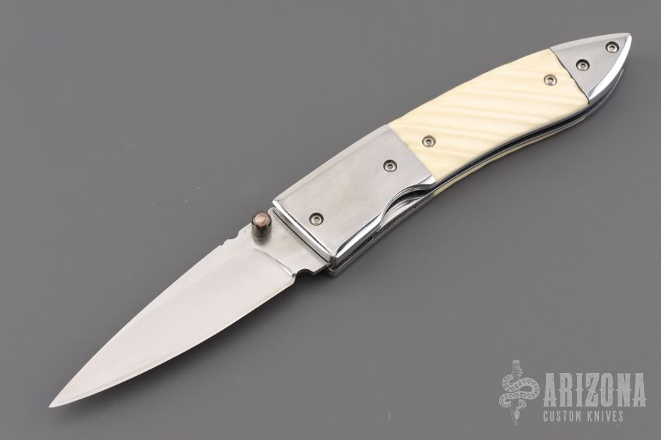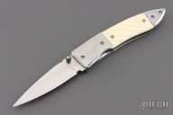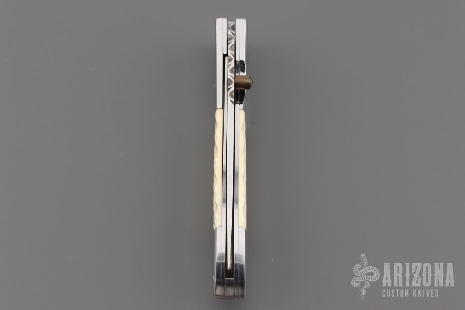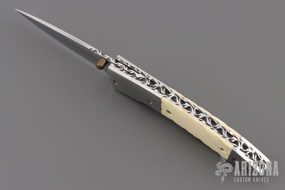 This knife by Master of Knife features a satin finished blade with a single brass thumbstud with black lip pearl inlay and fileworked blade spine. The handle has stainless steel bolsters, fluted bone scales, fileworked stainless steel liners and backspacer. Nice detent, blade seating and lockup. Has a couple very light scratches, otherwise excellent condition.