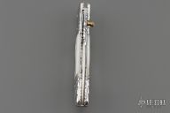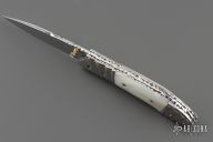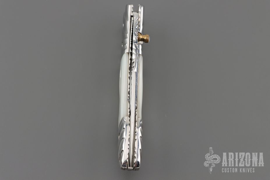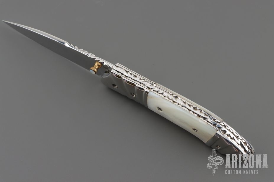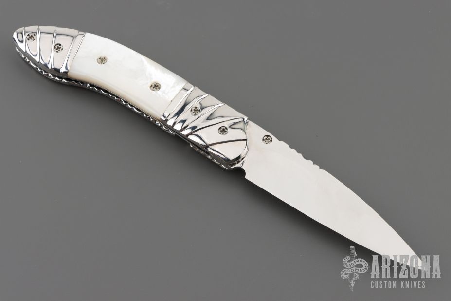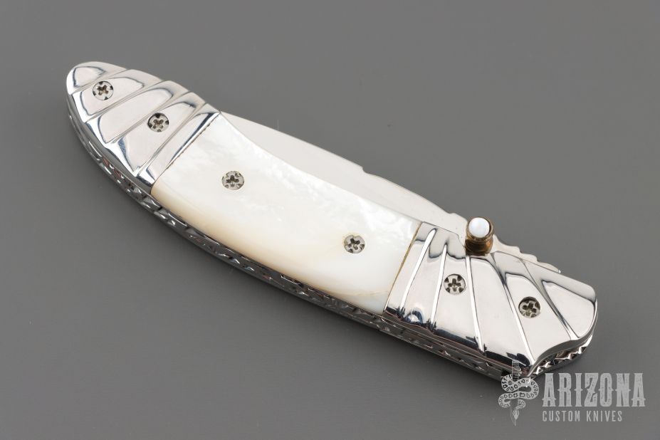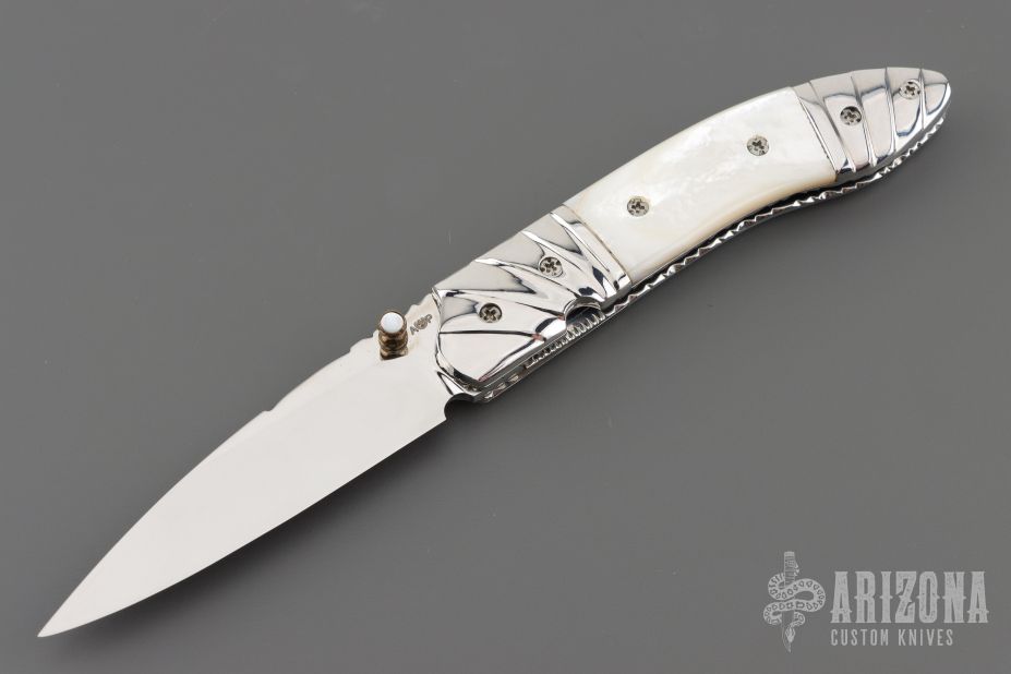This knife by Master of Knife features a mirror polished blade with a single brass thumbstud with buffalo horn inlay and fileworked blade spine. The handle has fluted stainless steel bolsters, carved gold lip pearl scales, fileworked stainless steel liners and backspacer. Nice detent, blade seating and lockup. Has a couple very light scratches, otherwise excellent condition.