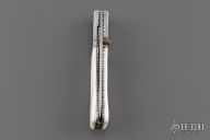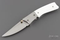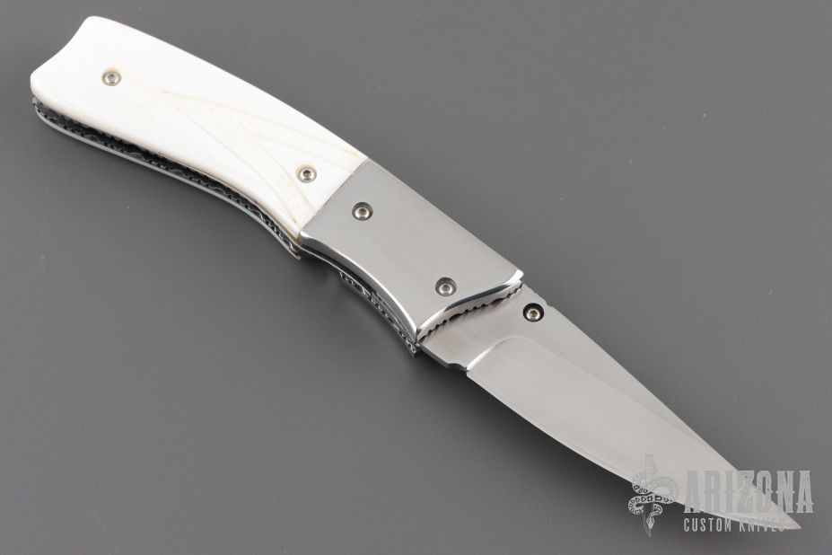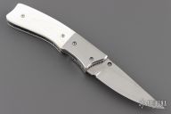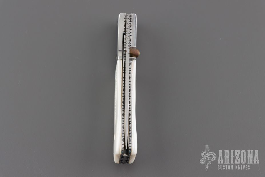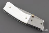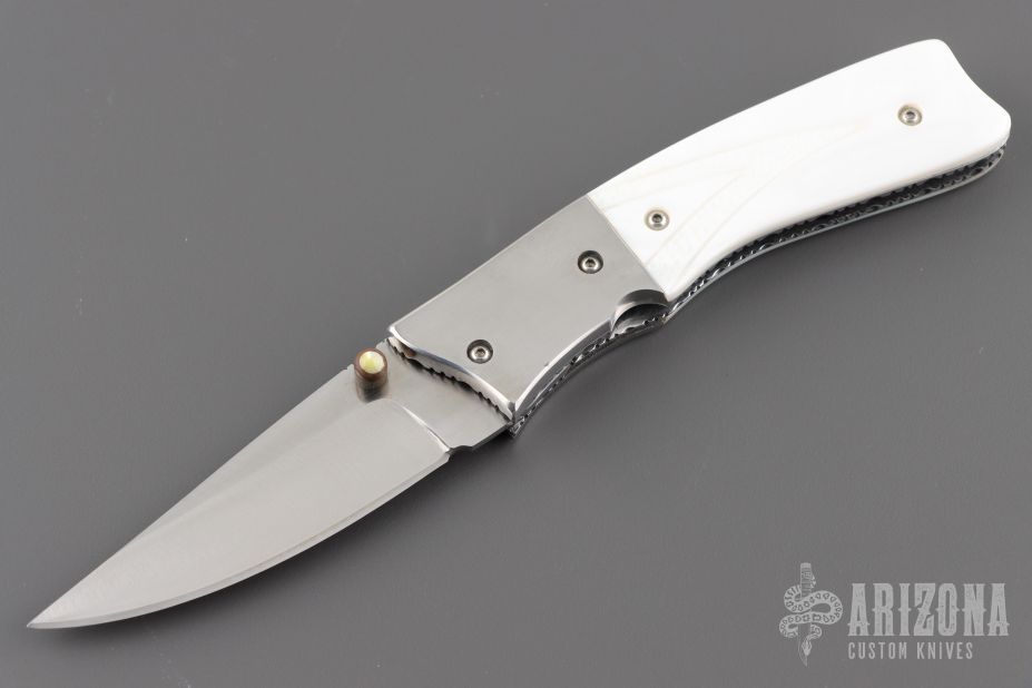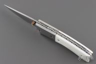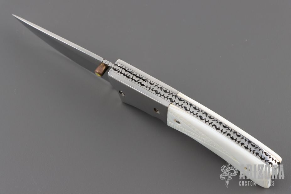 This knife by Master of Knife features a satin finished blade with a single brass thumbstud with gold lip pearl inlay and fileworked blade spine. The handle has stainless steel bolsters, carved mother of pearl scales, fileworked stainless steel liners and backspacer. Nice detent, blade seating and lockup. Has a couple very light scratches, otherwise excellent condition.