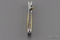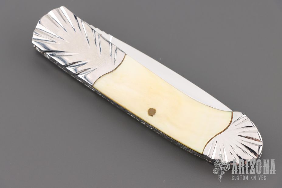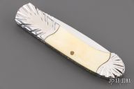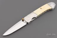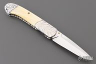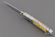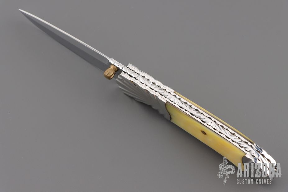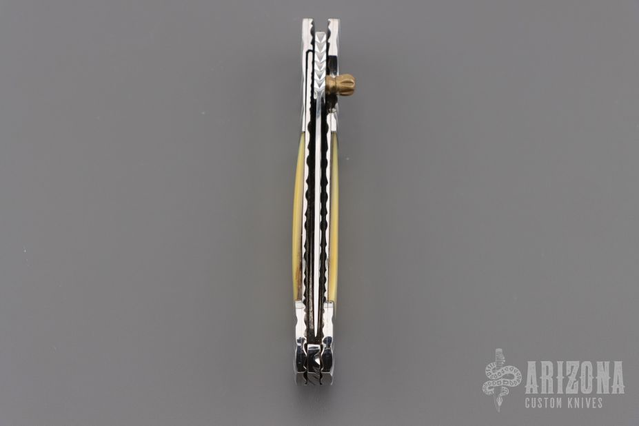 This knife by Master of Knife features a mirror polished blade with a single brass thumbstud and fileworked blade spine. The handle has fileworked stainless steel bolsters, gold lip pearl scales, fileworked stainless steel liners and backspacer. Nice detent, blade seating and lockup. Has a couple very light scratches, otherwise excellent condition.