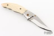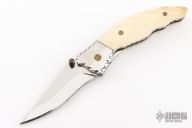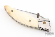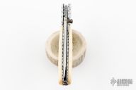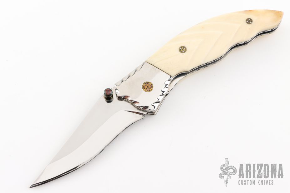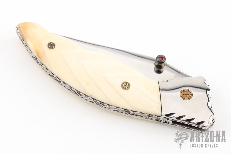 This knife by Master of Knife features a mirror polished blade with a single brass thumbstud with red stone inlay and notched blade spine. The handle has fileworked stainless steel bolsters, carved bone scales, fileworked stainless steel liners and backspacer. Nice lockup. Has a couple very light scratches, otherwise excellent condition.