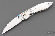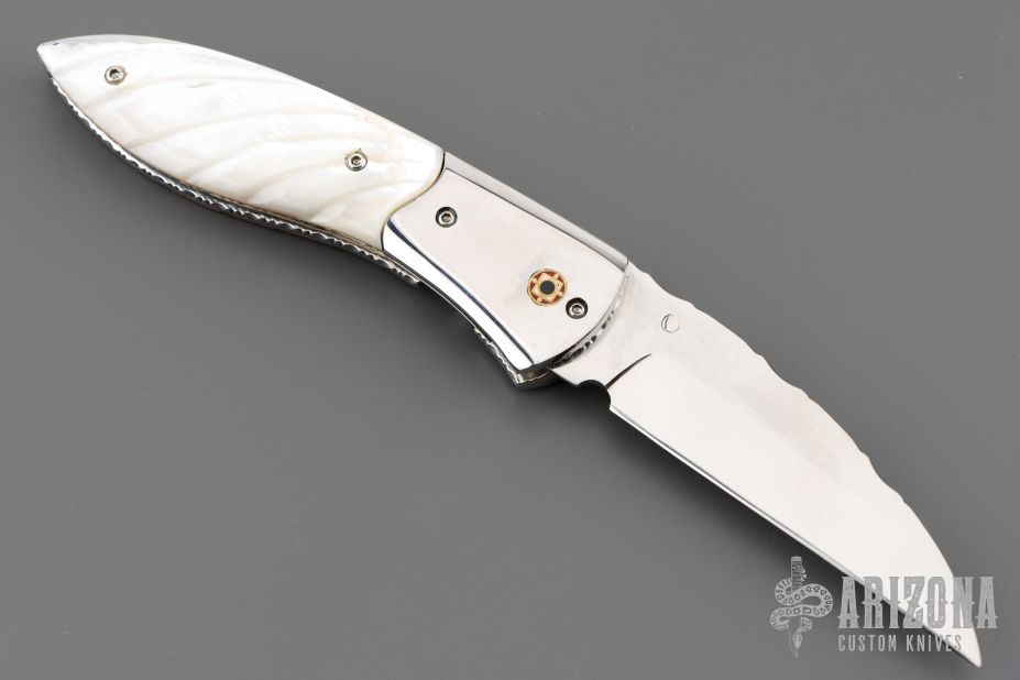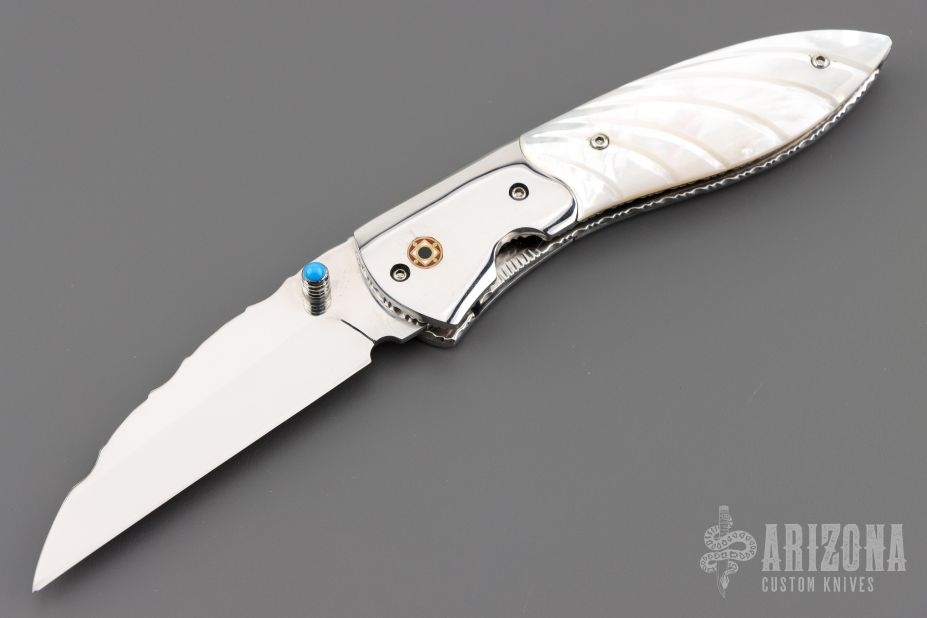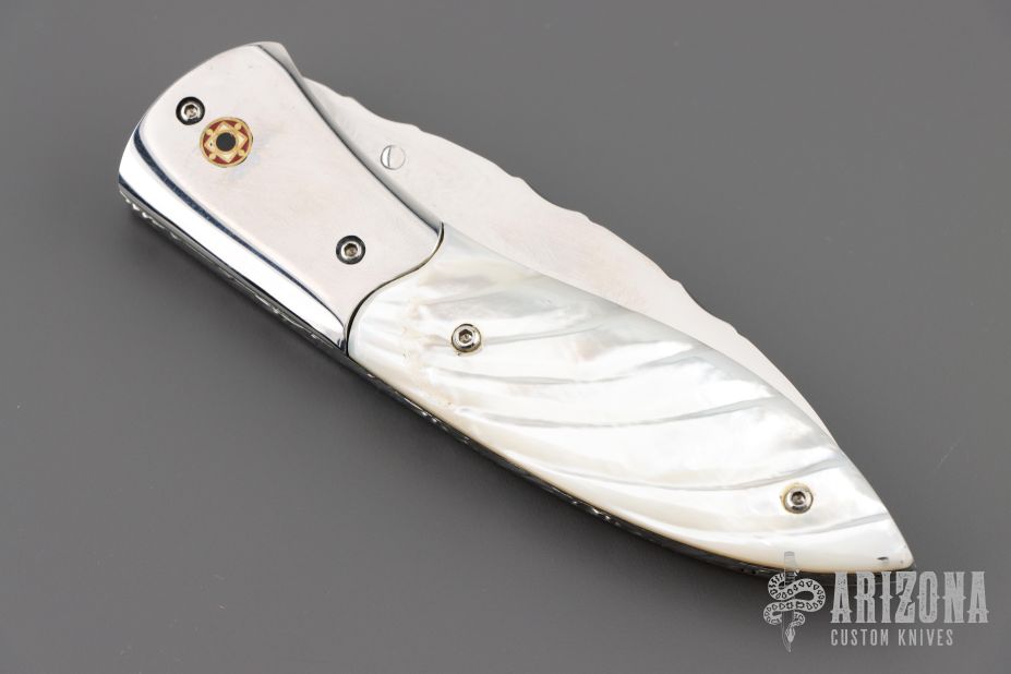 This knife by Master of Knife features a mirror polished blade with a single thumbstud with turquoise inlay and fileworked blade spine. The handle has stainless steel bolsters, carved mother of pearl scales, fileworked stainless steel liners and backspacer. Nice detent, blade seating and lockup. Has a couple very light scratches, otherwise excellent condition.