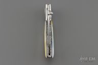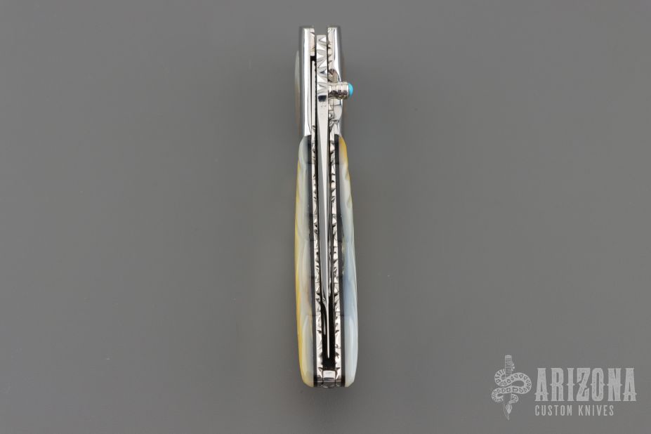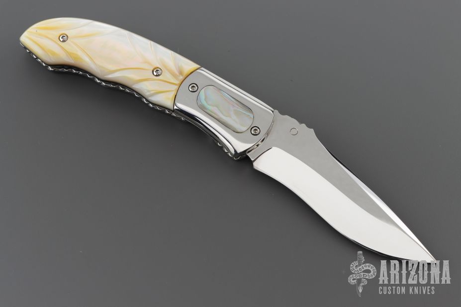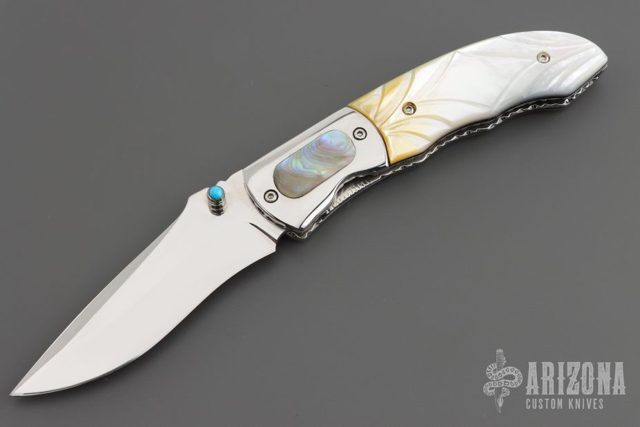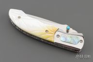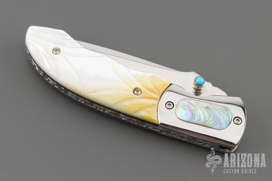This knife by Master of Knife features a mirror polished blade with a single thumbstud with turquoise inlay and fileworked blade spine. The handle has stainless steel bolsters with abalone inlays, carved gold lip pearl scales, fileworked stainless steel liners and backspacer. Nice detent, blade seating and lockup. Has a couple very light scratches, otherwise excellent condition.