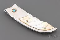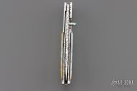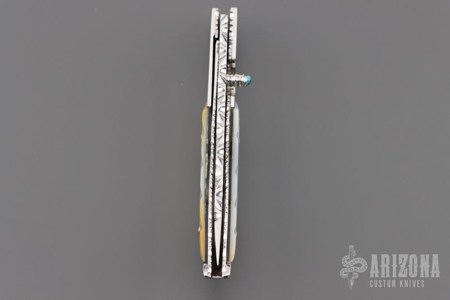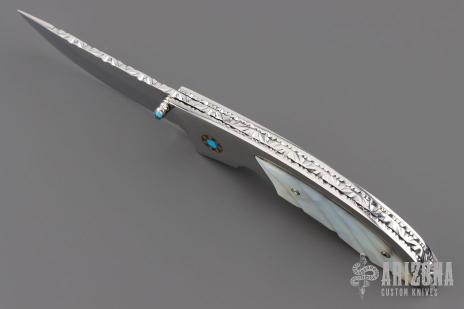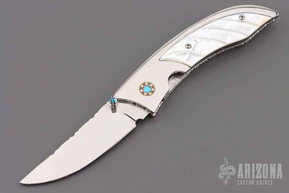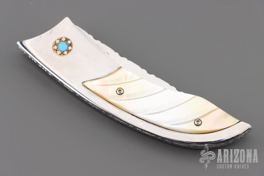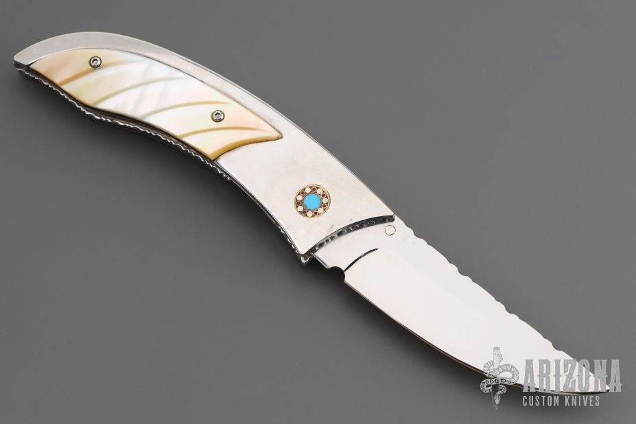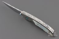 This knife by Master of Knife features a mirror polished blade with a single thumbstud with turquoise inlay and fileworked blade spine. The handle has stainless steel scales with carved gold lip pearl scales, fileworked stainless steel liners and backspacer. Nice detent and blade seating. Has a couple very light scratches, otherwise excellent condition.