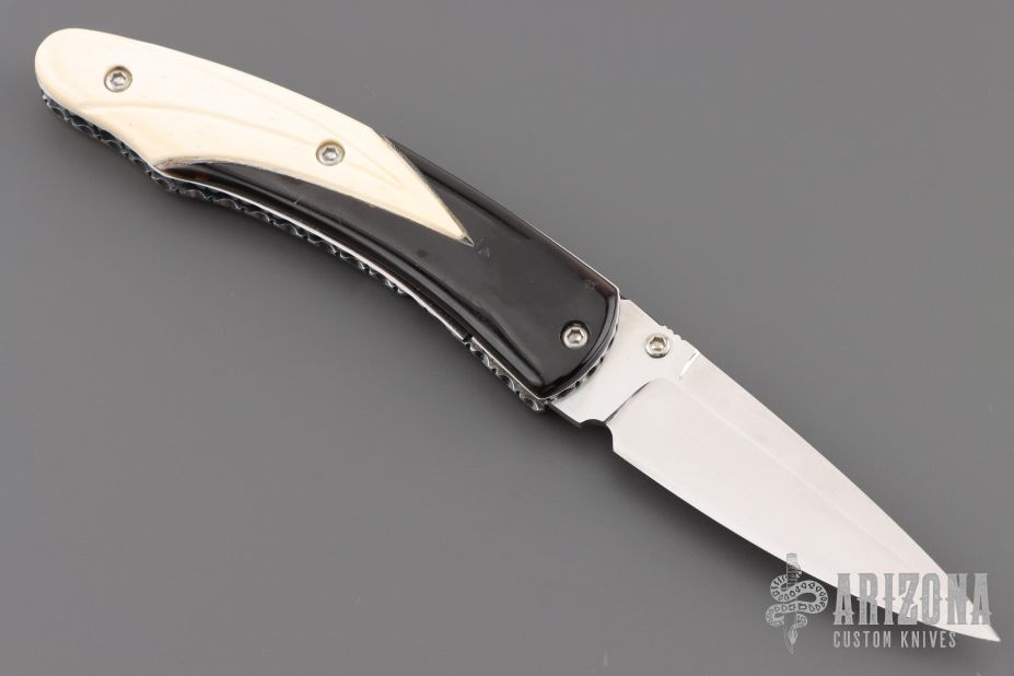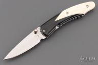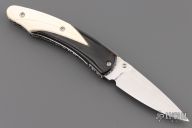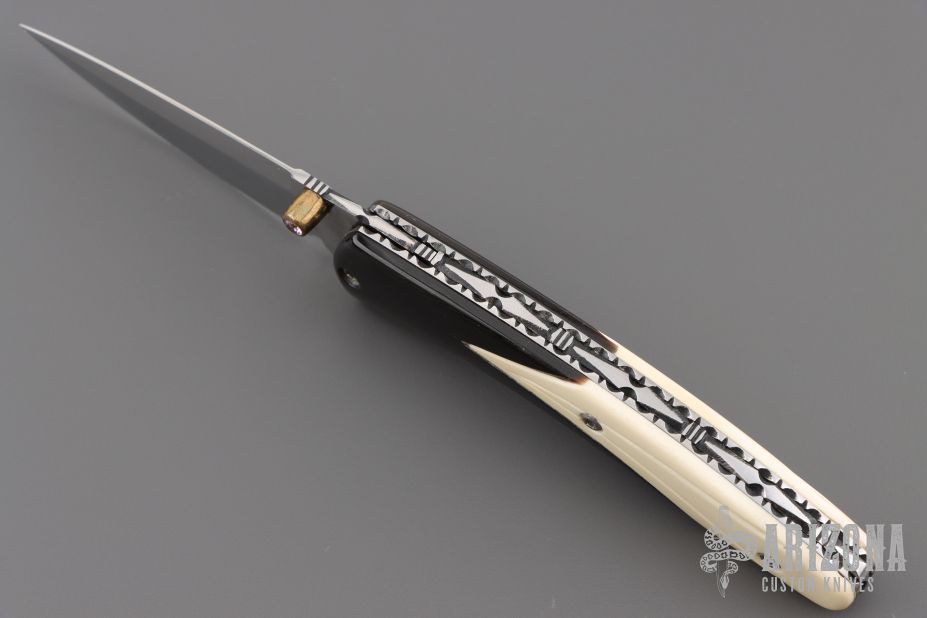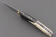 This knife by Master of Knife features a satin finished blade with a single brass thumbstud with clear stone inlay and fileworked blade spine. The handle has buffalo horn bolsters, carved bone scales, fileworked stainless steel liners and backspacer. Nice detent, blade seating and lockup. Has a couple very light scratches, otherwise excellent condition.