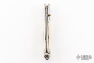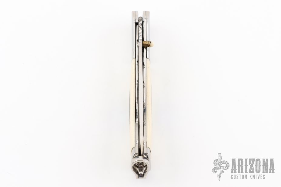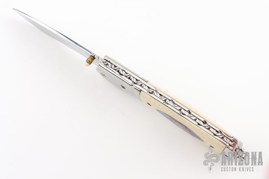 This knife by Master of Knife features a mirror polished blade with a single brass thumbstud bone inlay and fileworked blade spine. The handle has fluted stainless steel bolsters, bone scales with abalone inlays, fileworked stainless steel liners and backspacer. Nice lockup. Has a couple very light scratches, otherwise excellent condition.
