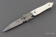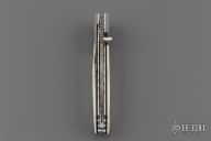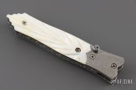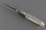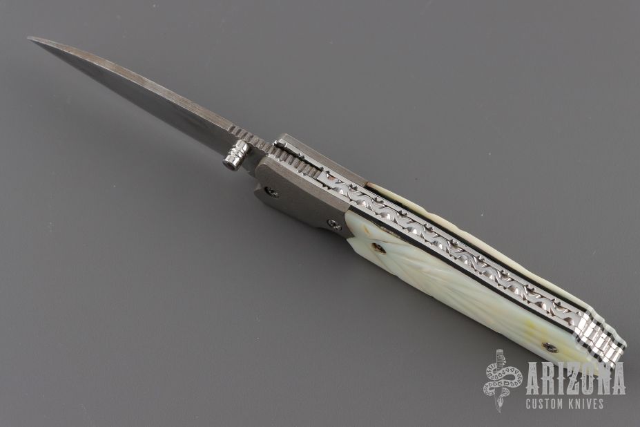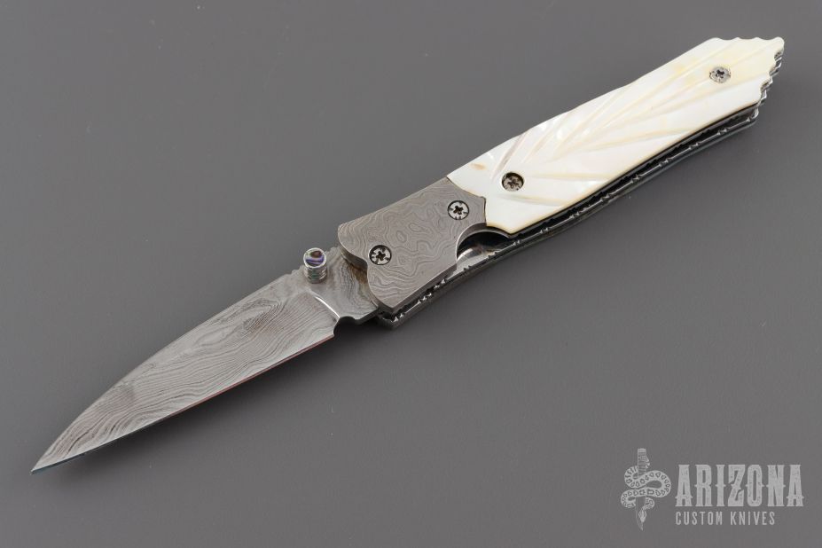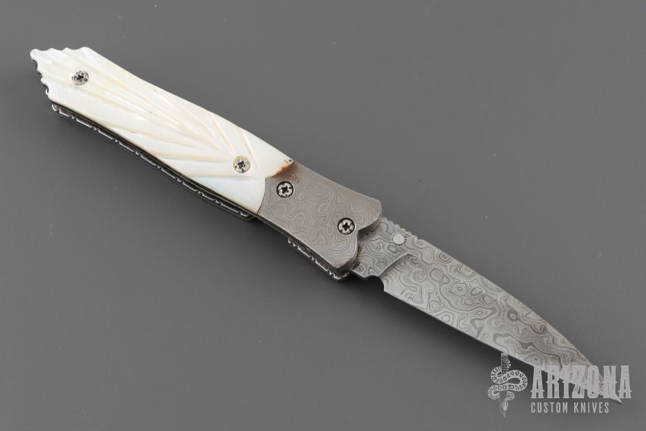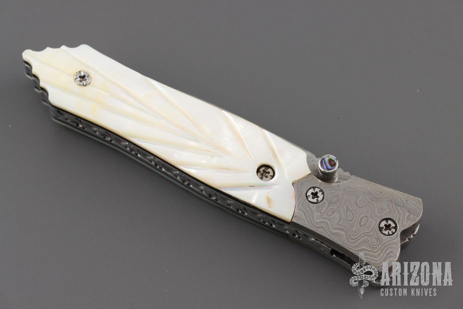 This knife by Master of Knife features a Damascus blade with a single thumbstud with abalone inlay and notched blade spine. The handle has Damascus bolsters, fluted mother of pearl scales, fileworked stainless steel liners and backspacer. Nice detent, lockup and blade seating. Has a couple very light scratches, otherwise excellent condition.