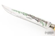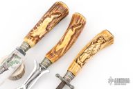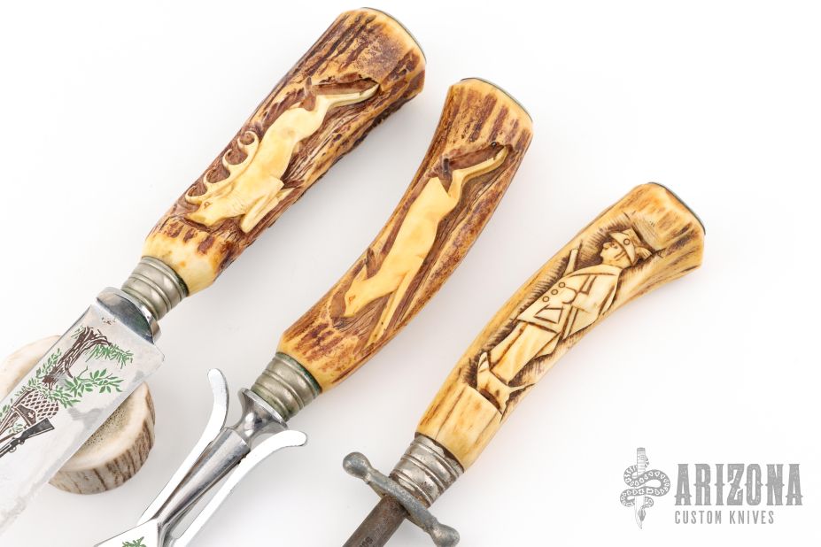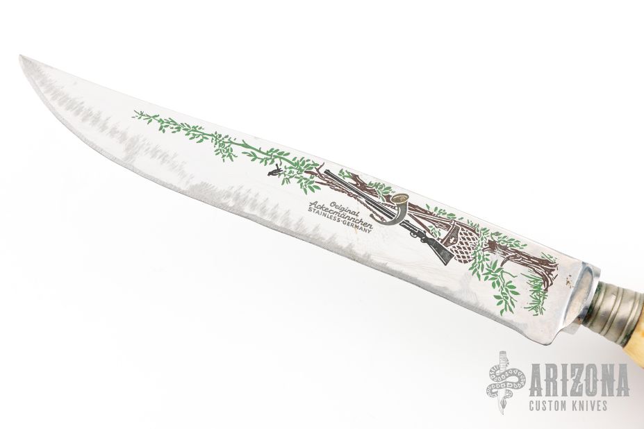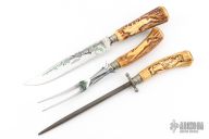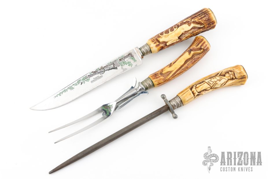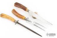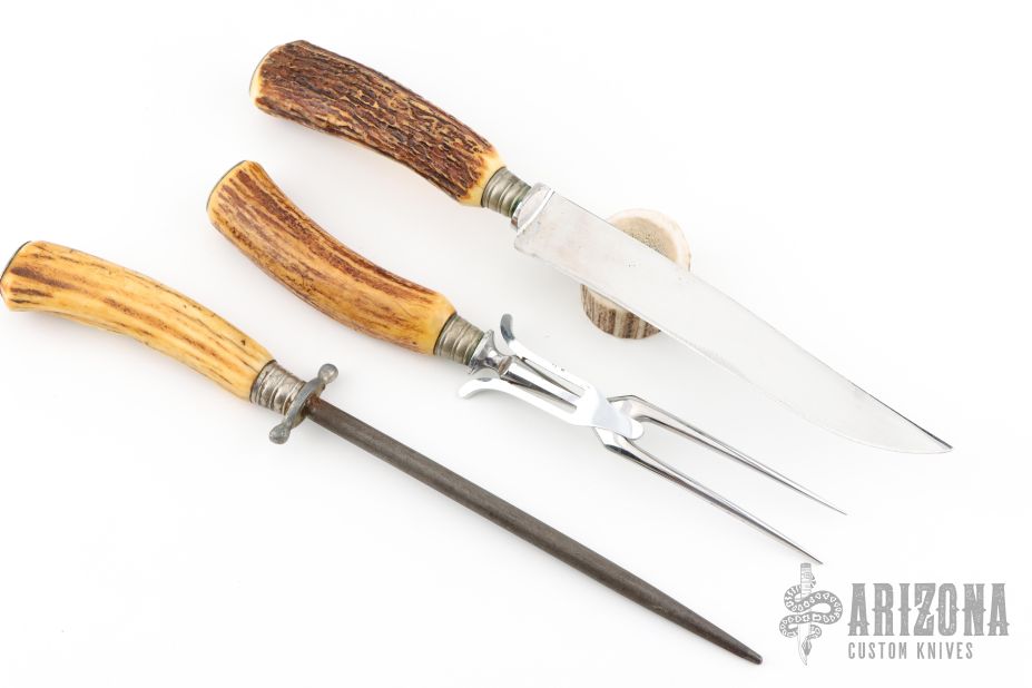 This Carving Set by Ackermannchen Knives features a mirror polished blade with and integral guard, .108" blade stock and 1.16" blade depth, hidden tang construction. The handle has a large carved stag grip. Comes with a matching carving fork and steel. Knife has been resharpened, has scratches, and patina. Fork and Steel have scratches, and patina also. Good condition for their age.