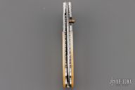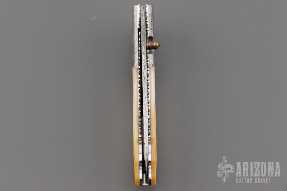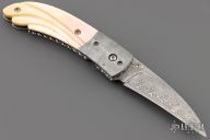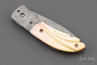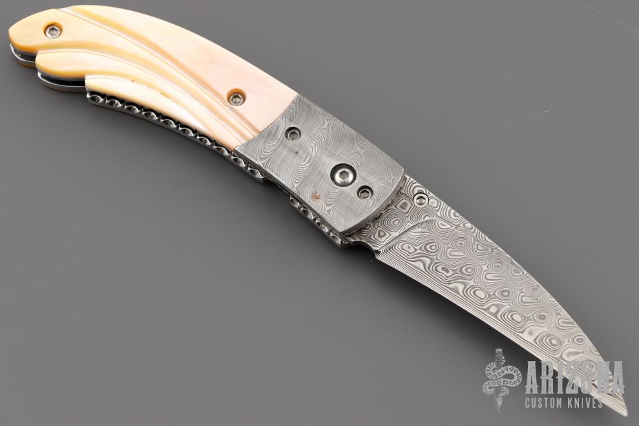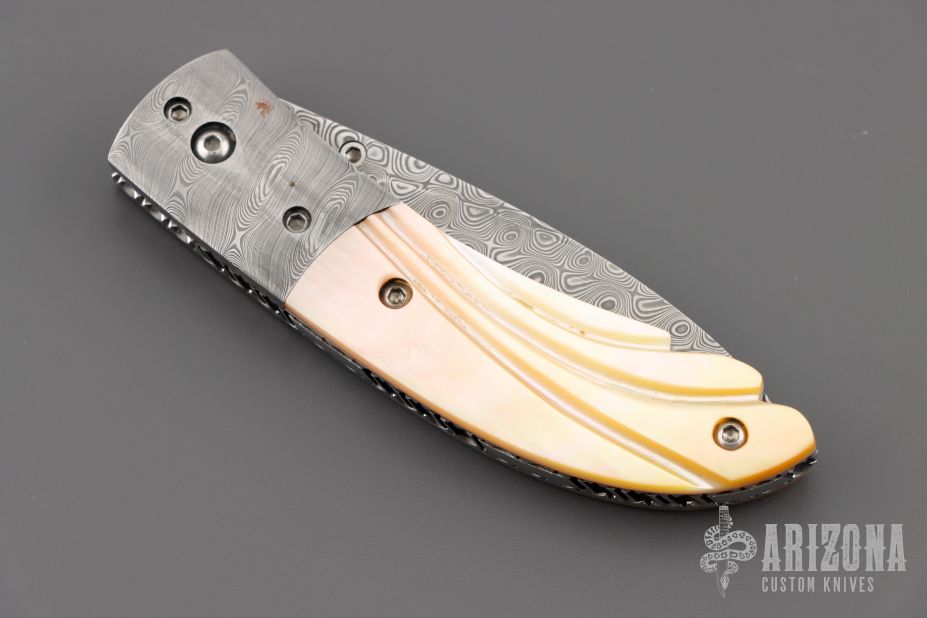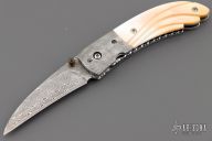 This knife by Master of Knife features a Damascus blade with a single brass thumbstud. The handle has Damascus bolsters, fluted gold lip pearl scales, fileworked stainless steel liners and backspacer. Nice lockup. Has a couple very light scratches, otherwise excellent condition.