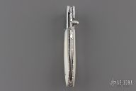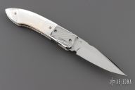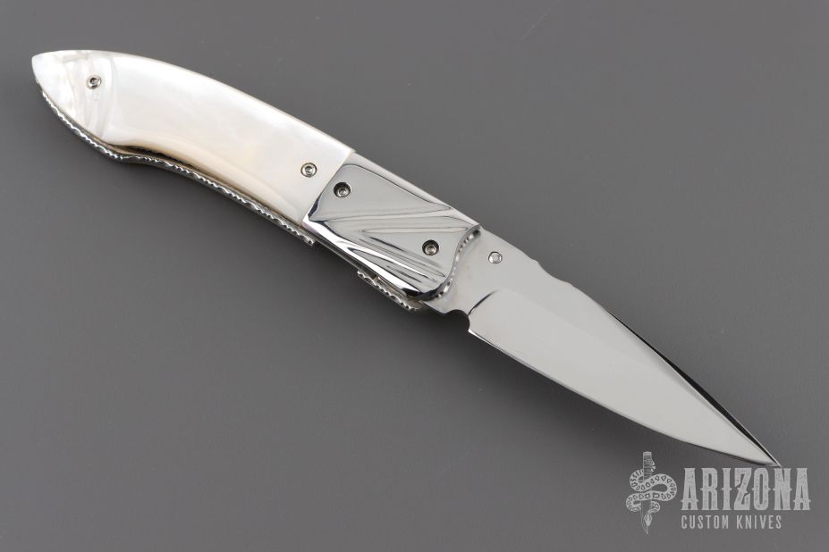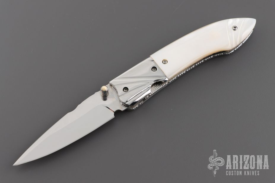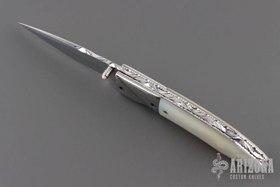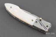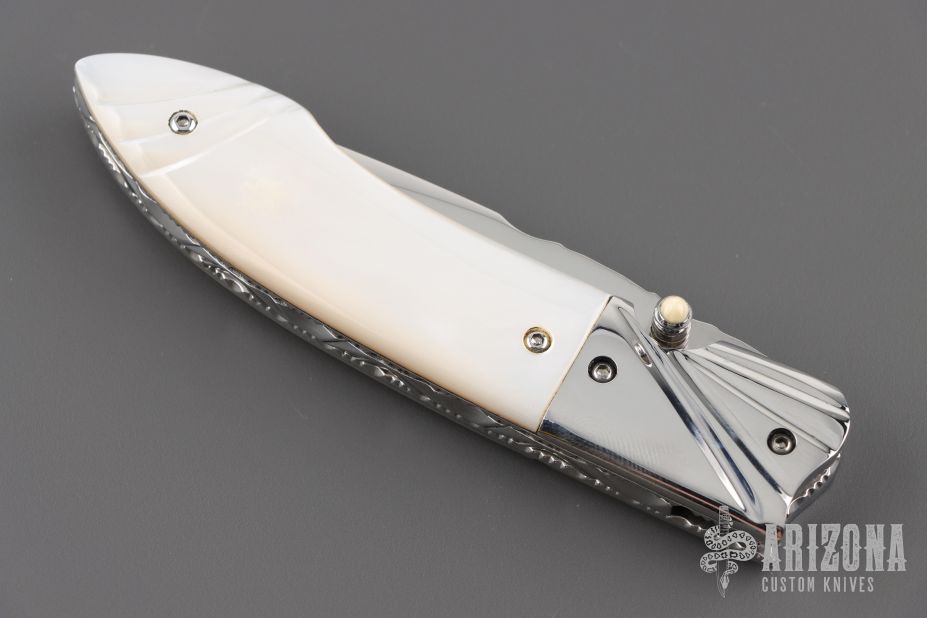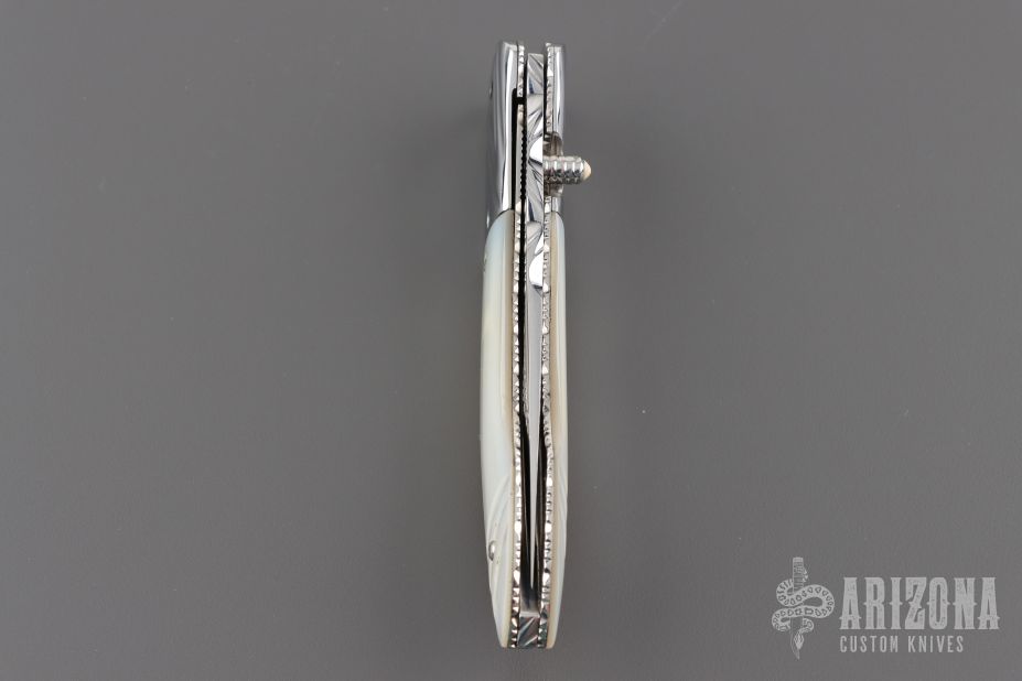 This knife by Master of Knife features a mirror polished blade with a single thumbstud with bone inlay and fileworked blade spine. The handle has stainless steel bolsters, carved mother of pearl scales, fileworked stainless steel liners and backspacer. Nice detent, blade seating and lockup. Has a couple very light scratches, otherwise excellent condition.
