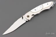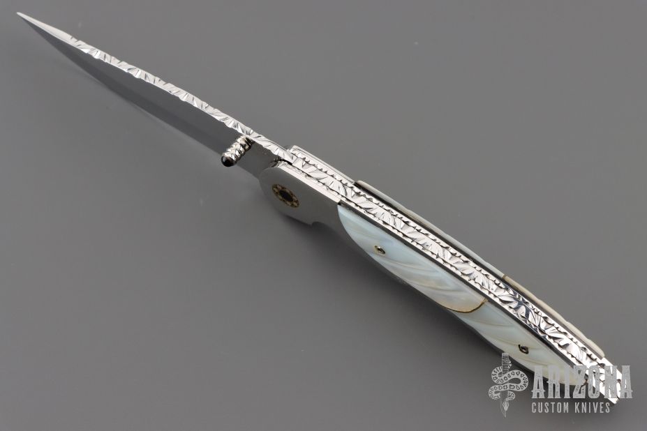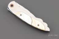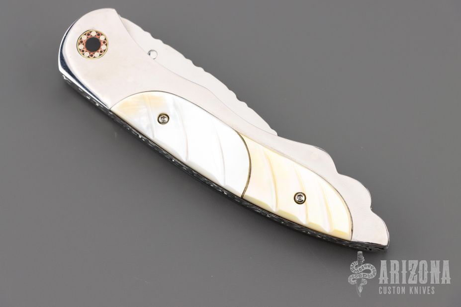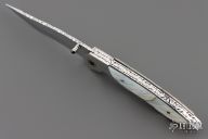 This knife by Master of Knife features a mirror polished blade with a single thumbstud with buffalo horn inlay and fileworked blade spine. The handle has stainless steel scales with carved mother of pearl inlays, fileworked stainless steel liners and backspacer. Nice detent, blade seating and lockup. Has a couple very light scratches, otherwise excellent condition.
