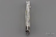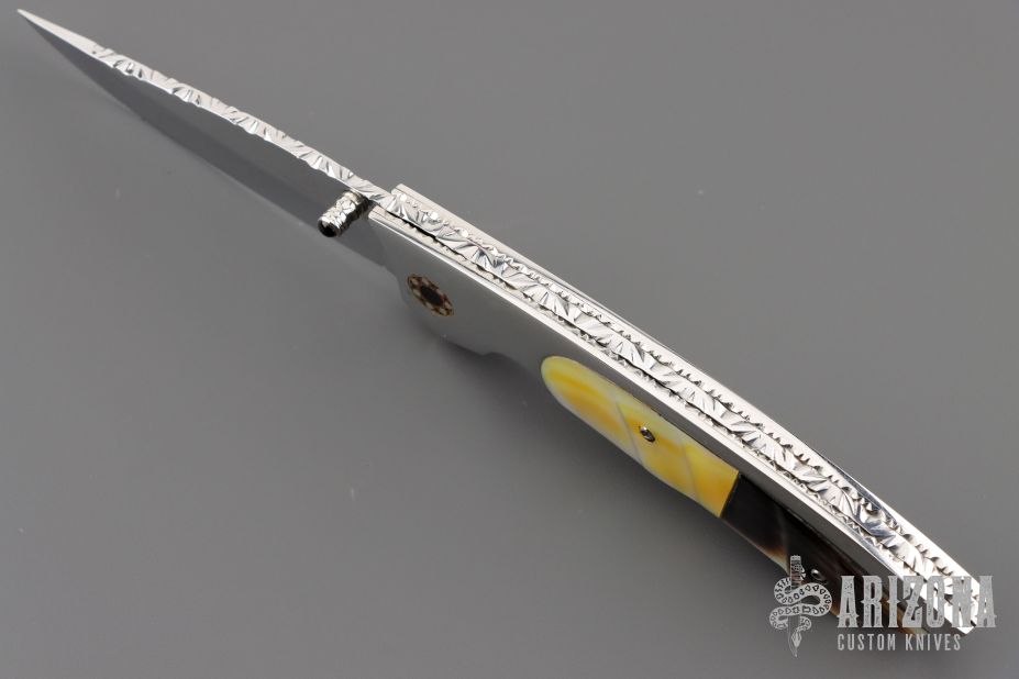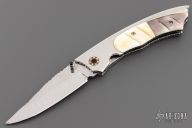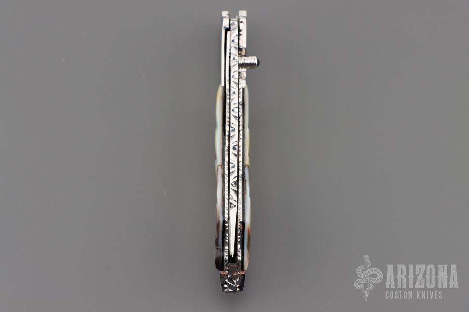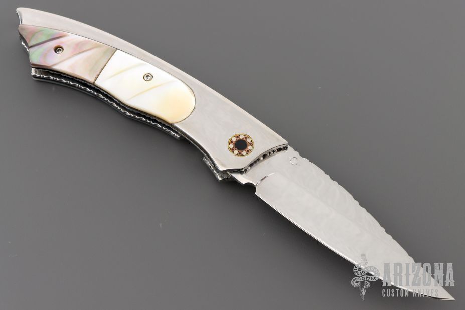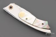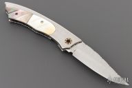 This knife by Master of Knife features a mirror polished blade with a single thumbstud with buffalo horn inlay and fileworked blade spine. The handle has stainless steel scales with carved gold and black lip pearl inlays, fileworked stainless steel liners and backspacer. Nice detent, blade seating and lockup. Has a couple very light scratches, otherwise excellent condition.