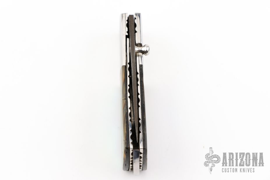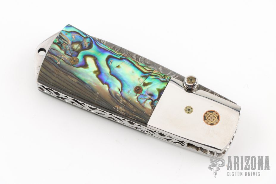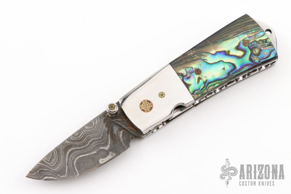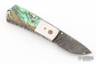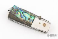 This knife by Master of Knife features a Damascus blade with a single thumbstud with mosaic pin inlay. The handle has stainless steel bolsters, abalone scales, fileworked stainless steel liners and backspacer. Has a couple very light scratches, otherwise excellent condition.
