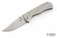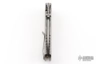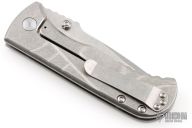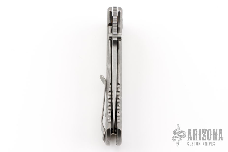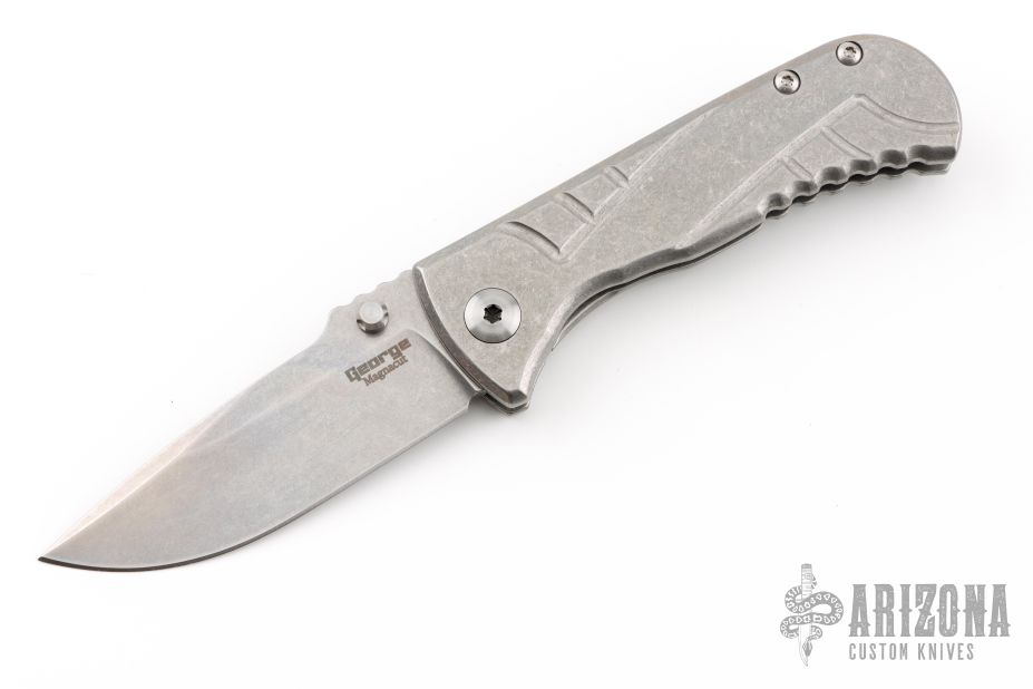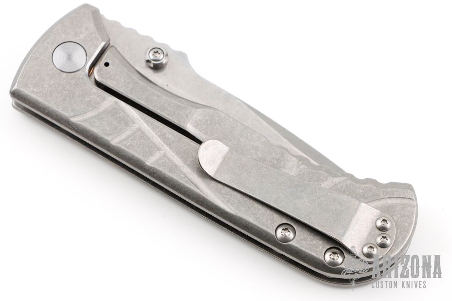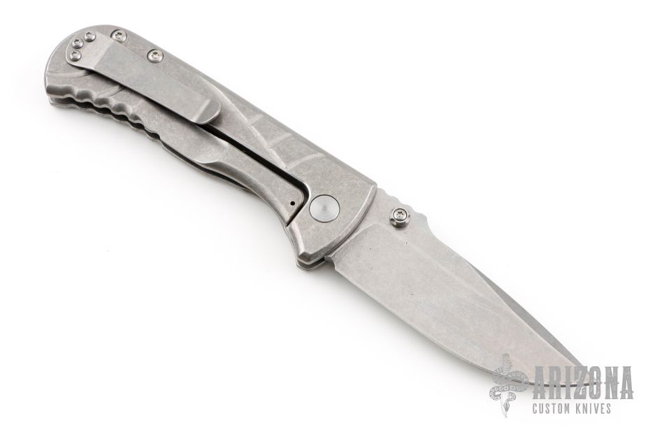 This Talos by Les George features a stonewashed blade with a false top edge, notched thumbrest and reversible dual thumbstud. The handle has a "Sweep" stonewashed titanium with matching tip up clip. Nice detent, lockup and blade seating. Very smooth action. New condition. Comes with original zippered case.