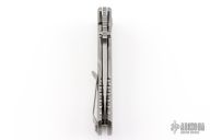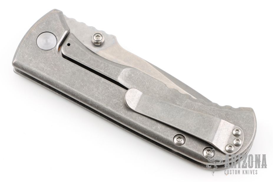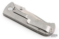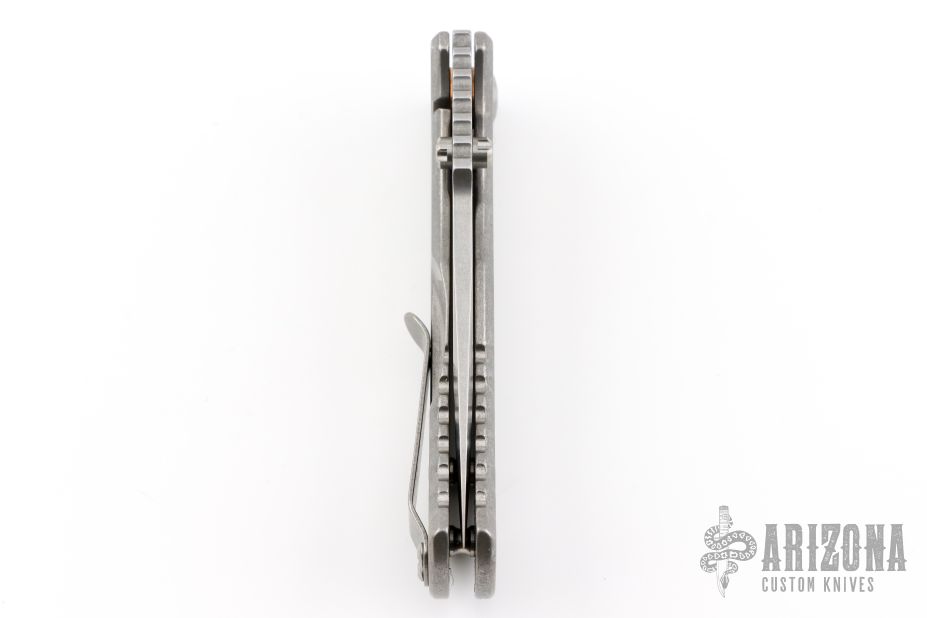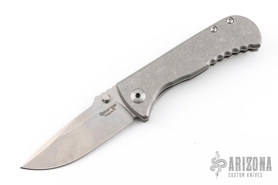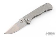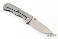 This Talos by Les George features a stonewashed blade with a false top edge, notched thumbrest and reversible dual thumbstud. The handle has a smooth stonewashed titanium with matching tip up clip. Nice detent, lockup and blade seating. Very smooth action. New condition. Comes with original zippered case.