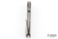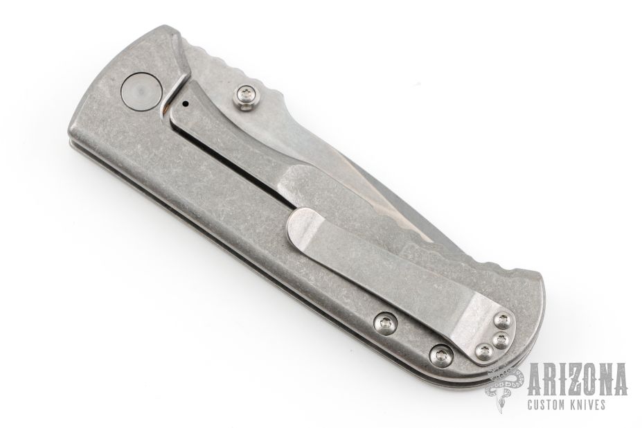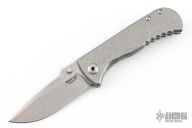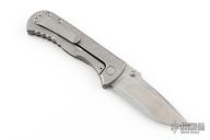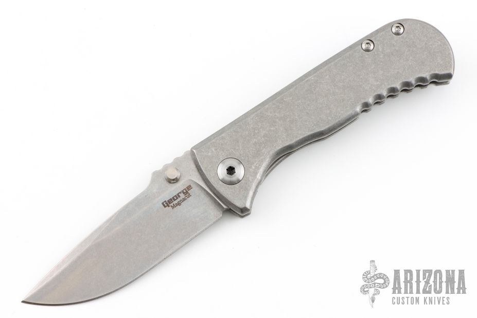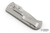 This Talos by Les George features a stonewashed blade with a false top edge, notched thumbrest and reversible dual thumbstud. The handle has a smooth stonewashed titanium with matching tip up clip. Nice detent, lockup and blade seating. Very smooth action. New condition. Comes with original zippered case.