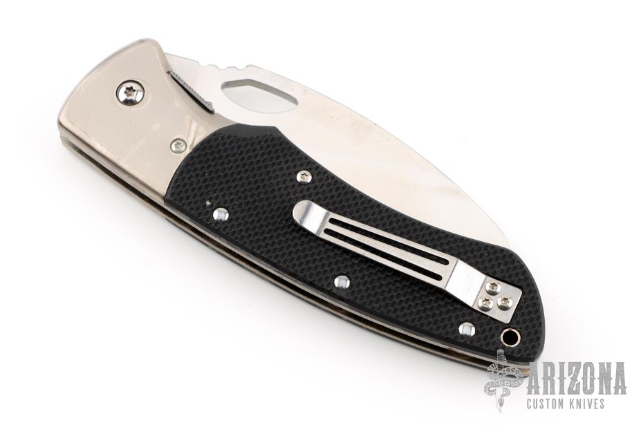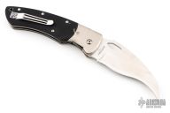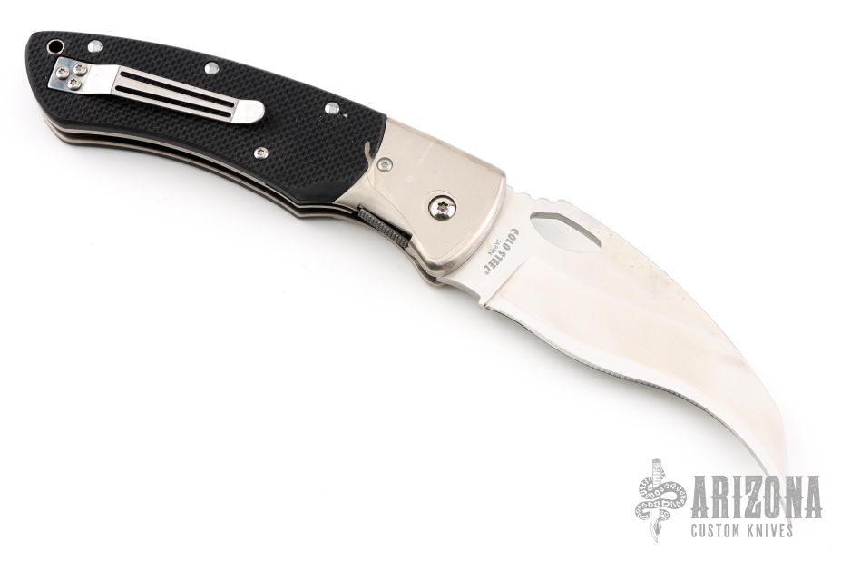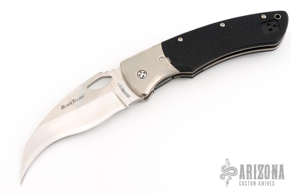 This Black Talon by Cold Steel features a satin finished hawkbill style San Mai blade with swedge and notched thumb ramp. The handle has a titanium bolsters and black G-10 scales. Includes a tip up stainless steel pocket clip. Still has protective plastic bolster covers. Includes the original box. This model has been discontinued.  Excellent Condition.