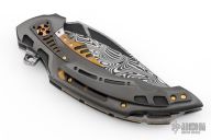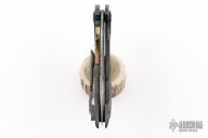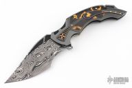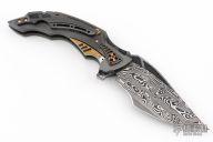 This Full Dressed framelock flipper by Ron Best is amazing. It features a Damasteel blade with textured cutout and a flipper. The handle has a zirconium frame, with titanium, and zirconium inlays/pivot collars, and tip up clip, milled and 3-tone anodized titanium backspacer, and an anodized titanium lockbar with polished stainless steel lockface insert. Inside of backspacer reads "Ronald Best #58" Nice detent, lockup and blade seating. Has a couple light scuffs, excellent condition otherwise.