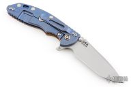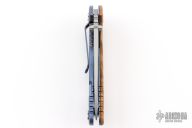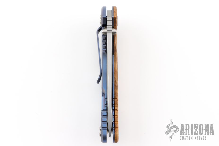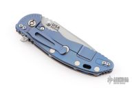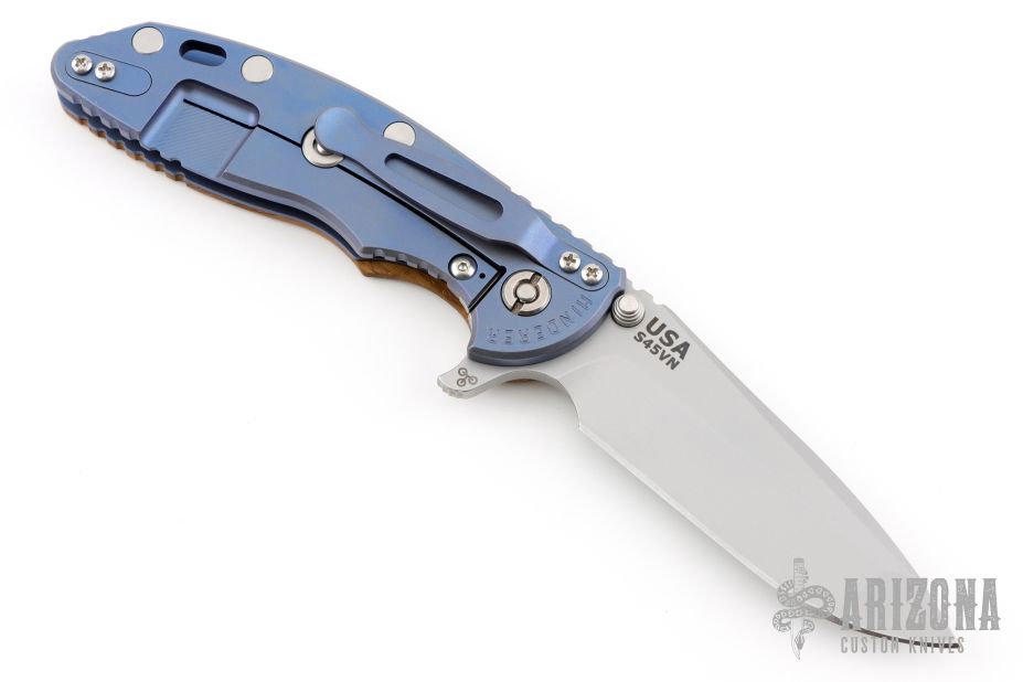 This XM-18 Slicer by Rick Hinderer Knives features a 3.5" bead blasted blade, notched thumbrest and dual thumbstuds. The handle has a smooth curly white oak scale, and a bead blasted blue titanium handle/clip. Clip can be mounted for tip up or down carry. Tri-way pivot system. Bead Blasted titanium hardware. Nice lockup, and detent. Includes the original box, extra hardware. New condition.