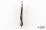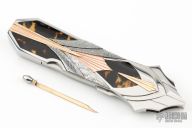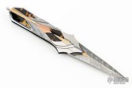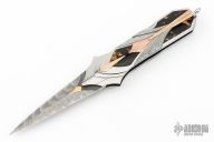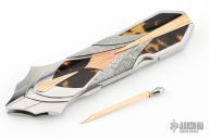 This Interframe Lockback Auto by Ron Best features a Damasteel dagger blade with false top edge. The handle has a stainless steel frame with beautiful gold, rose gold, and Damasteel overlays. The handle also has a stainless steel spacer and release button. Has gold toothpick in pommel with emerald inlay. Nice lockup, action and blade seating. Has a few light scratches, otherwise excellent condition.