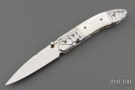 This knife by Appaloosa features a mirror polished blade with a single thumbstud with mother of pearl inlay and fileworked blade spine. The handle has carved stainless steel bolsters, mother of pearl scales, fileworked stainless steel liners and backspacer. Nice detent, blade seating and lockup. Has a couple very light scratches, otherwise excellent condition.