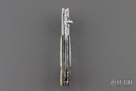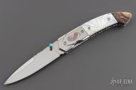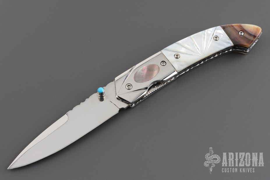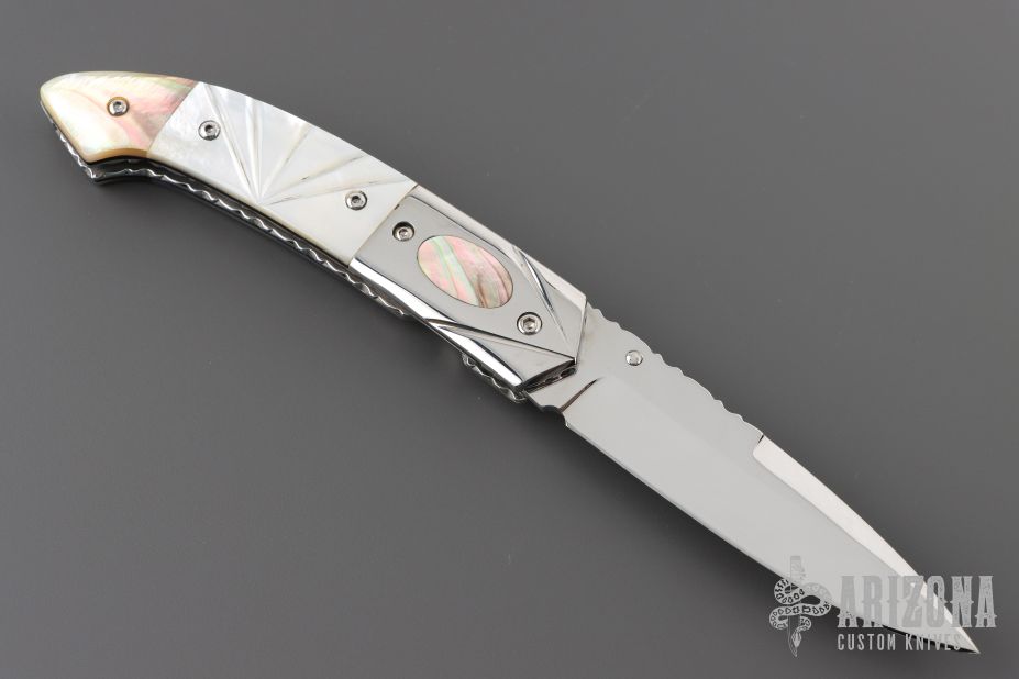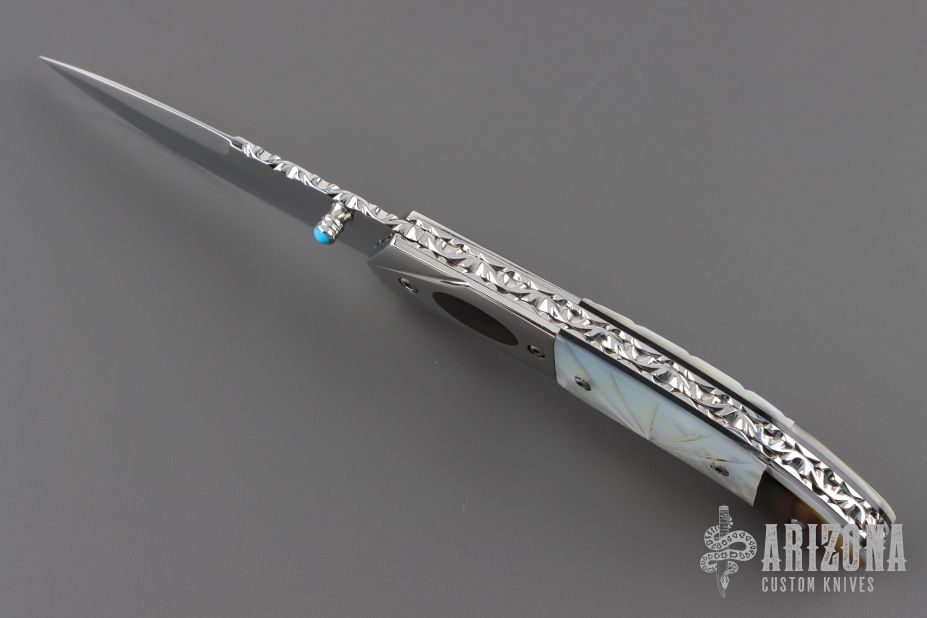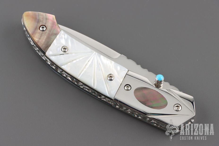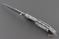 This knife by Master of Knife features a mirror polished blade with a single thumbstud with turquoise inlay and fileworked blade spine. The handle has carved stainless steel bolsters with black lip pearl inlays, carved mother of pearl and black lip pearl scales, fileworked stainless steel liners and backspacer. Nice detent, blade seating and lockup. Has a couple very light scratches, otherwise excellent condition.