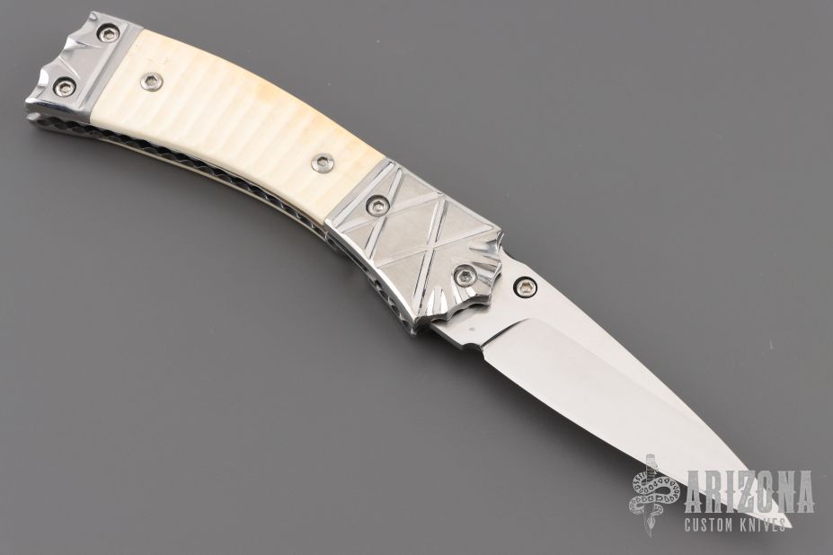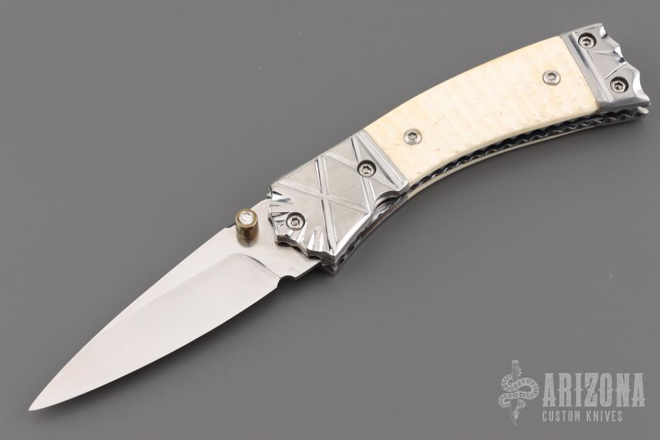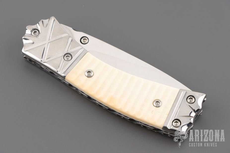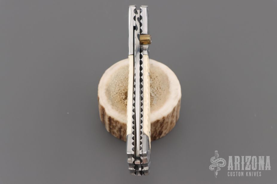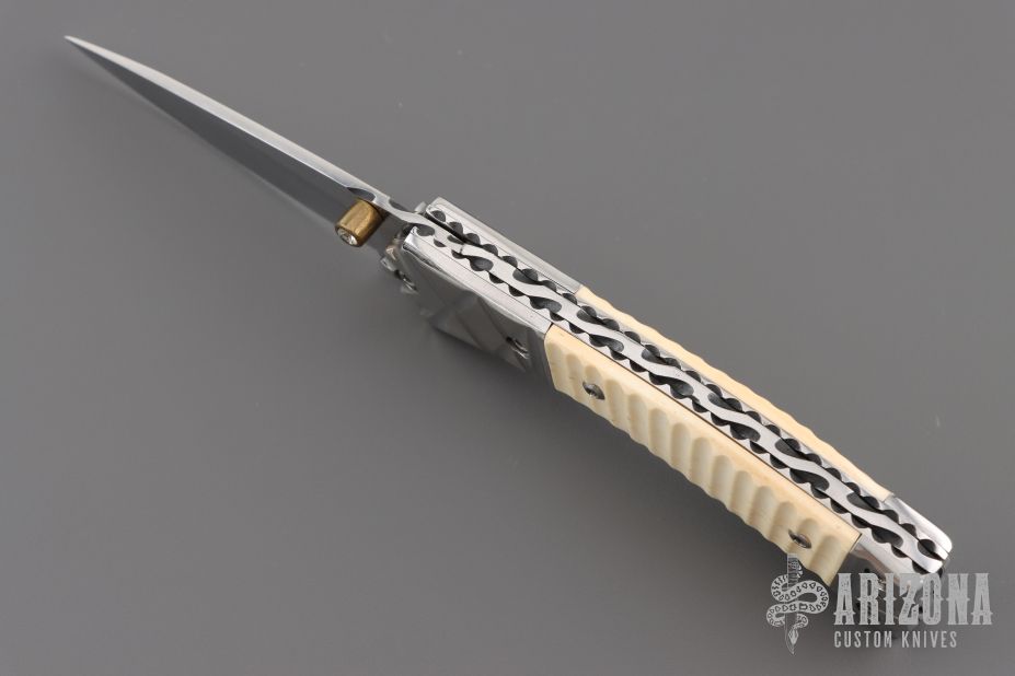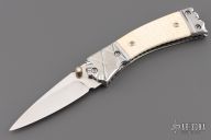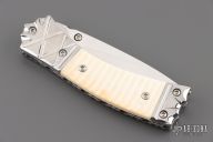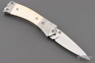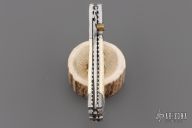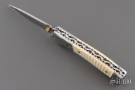 This knife by Master of Knife features a satin finished blade with a single brass thumbstud with clear stone inlay and fileworked blade spine. The handle has fluted stainless steel bolsters, fluted bone scales, fileworked stainless steel liners and backspacer. Nice detent, blade seating and lockup. Has a couple very light scratches, otherwise excellent condition.