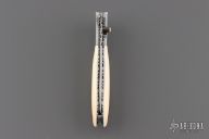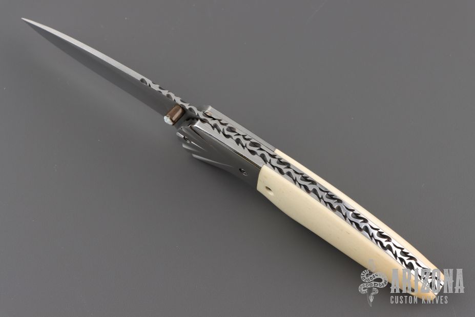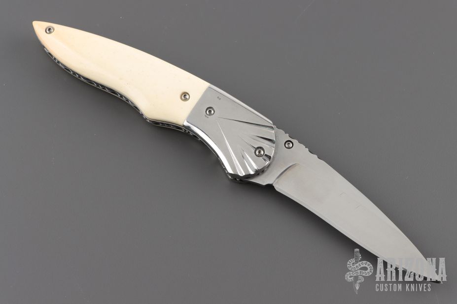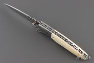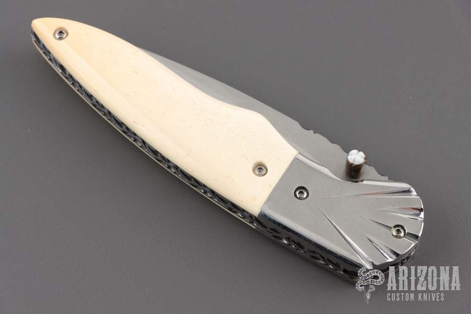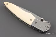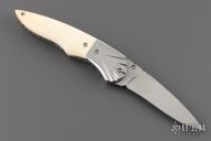 This knife by Master of Knife features a satin finished blade with a single brass thumbstud with mother of pearl inlay and fileworked blade spine. The handle has fluted stainless steel bolsters, bone scales, fileworked stainless steel liners and backspacer. Nice detent and lockup. Has a couple very light scratches, otherwise excellent condition.