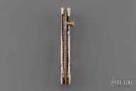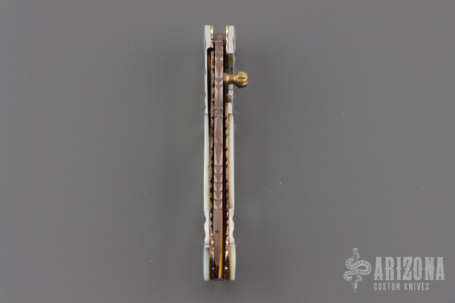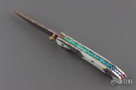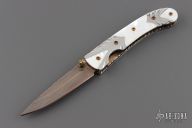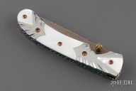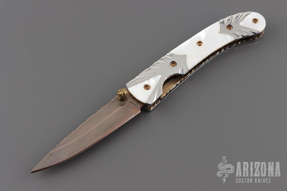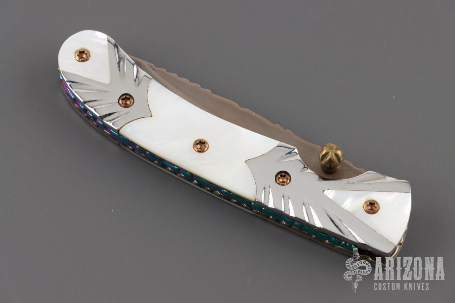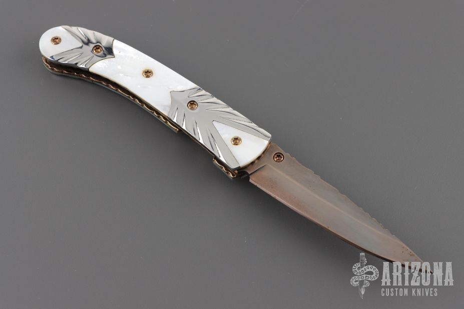This knife by Master of Knife features a satin finished blade with a single brass thumbstud and fileworked blade spine. The handle has carved stainless steel bolsters with mother of pearl inlays, mother of pearl scales, fileworked and head colored stainless steel liners and backspacer. Nice detent and lockup. Has a couple very light scratches and patina, otherwise good condition.