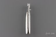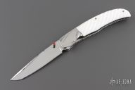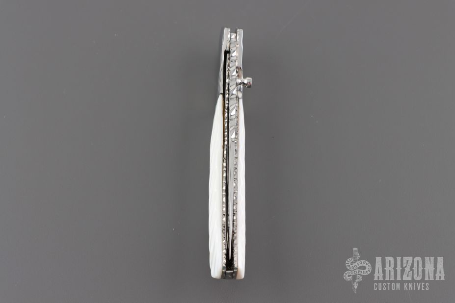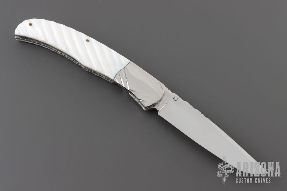 This knife by Master of Knife features a mirror finished blade with a single thumbstud with red stone inlay and fileworked blade spine. The handle has fluted stainless steel bolsters, fluted mother of pearl scales, fileworked stainless steel liners and backspacer. Nice detent, blade seating and lockup. Has a couple very light scratches, otherwise excellent condition.