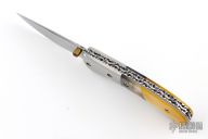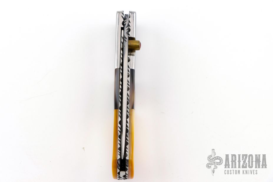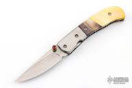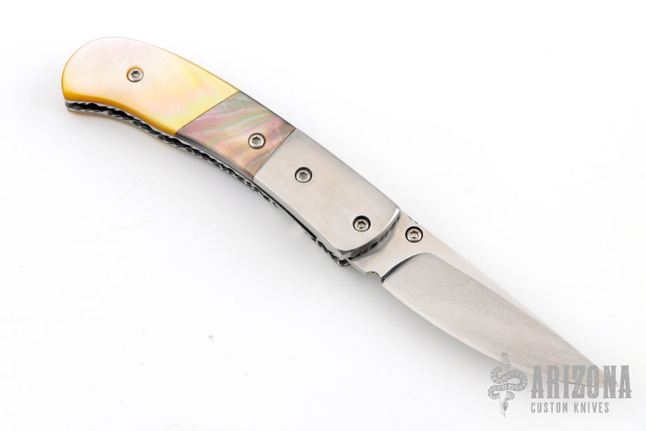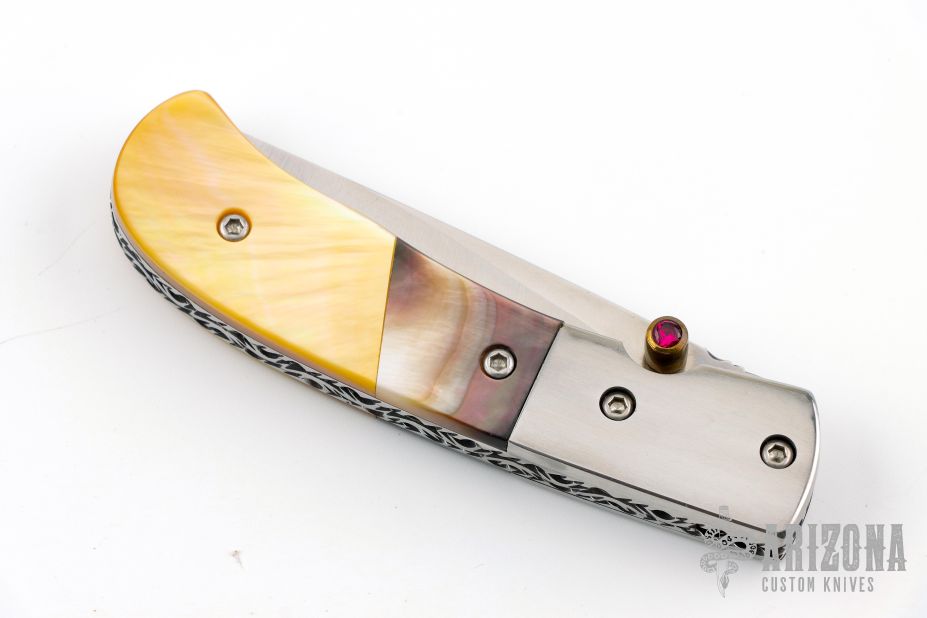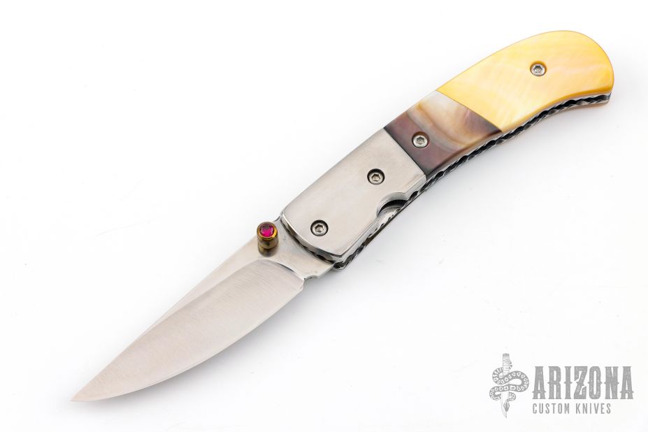 This knife by Master of Knife features a satin finished blade with a single brass thumbstud with red stone inlay and fileworked blade spine. The handle has stainless steel bolsters, black lip and gold lip pearl scales, fileworked stainless steel liners and backspacer. Nice blade seating and lockup. Has a couple very light scratches, otherwise excellent condition.