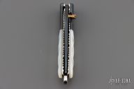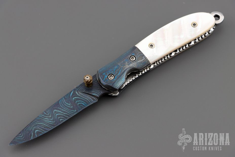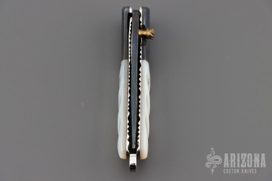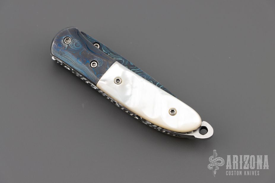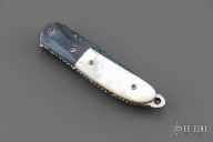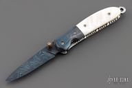 This knife by Master of Knife features a blued Damascus blade with a single brass thumbstud with mosaic pin inlay. The handle has blued Damascus bolsters, fluted mother of pearl scales, fileworked stainless steel liners and backspacer. Nice detent, blade seating and lockup. Excellent condition.