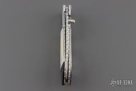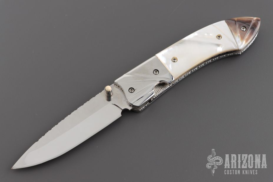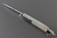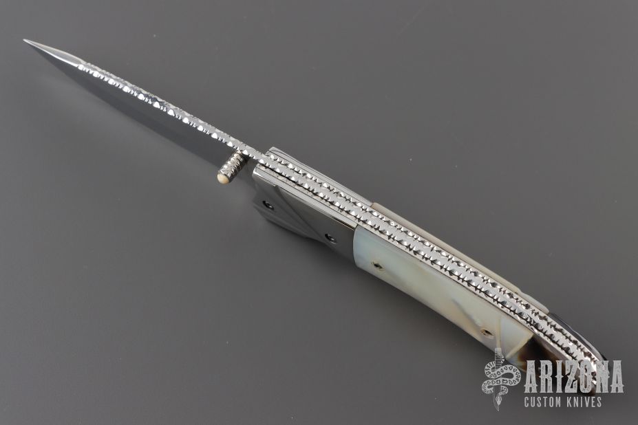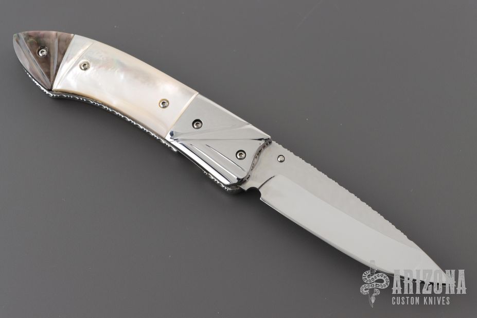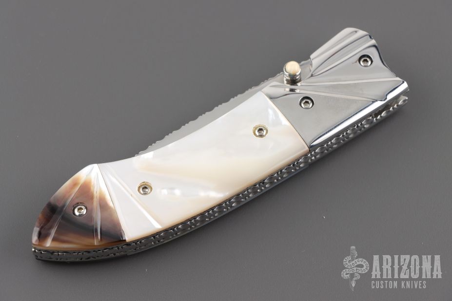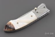 This knife by Master of Knife features a mirror finished blade with a single thumbstud with bone inlay and fileworked blade spine. The handle has fluted stainless steel bolsters, carved mother of pearl and black lip pearl scales, fileworked stainless steel liners and backspacer. Nice detent, blade seating and lockup. Has a couple very light scratches, otherwise excellent condition.