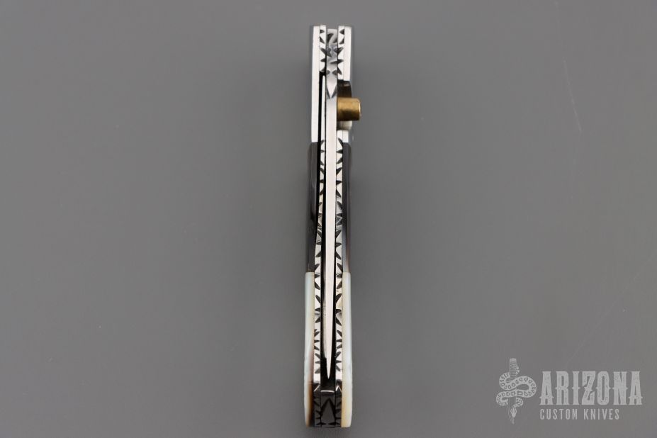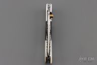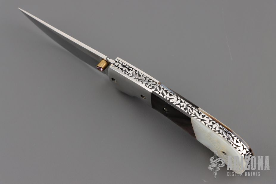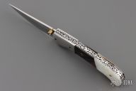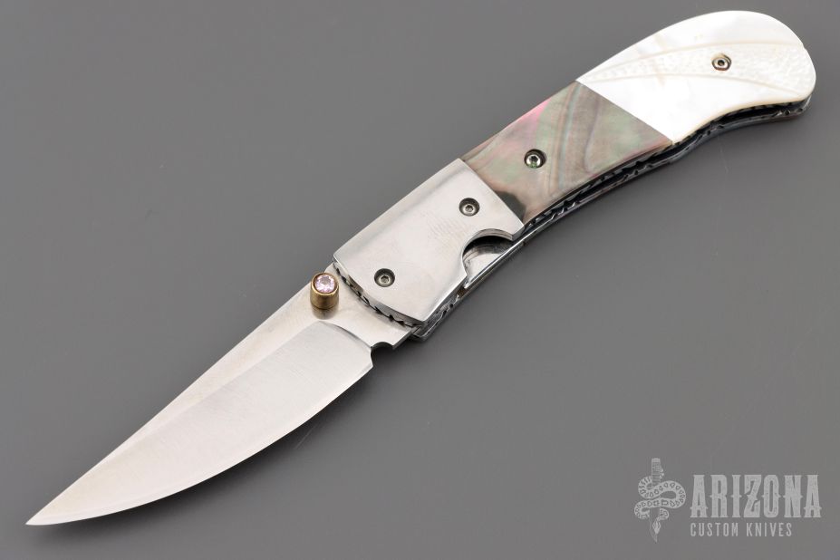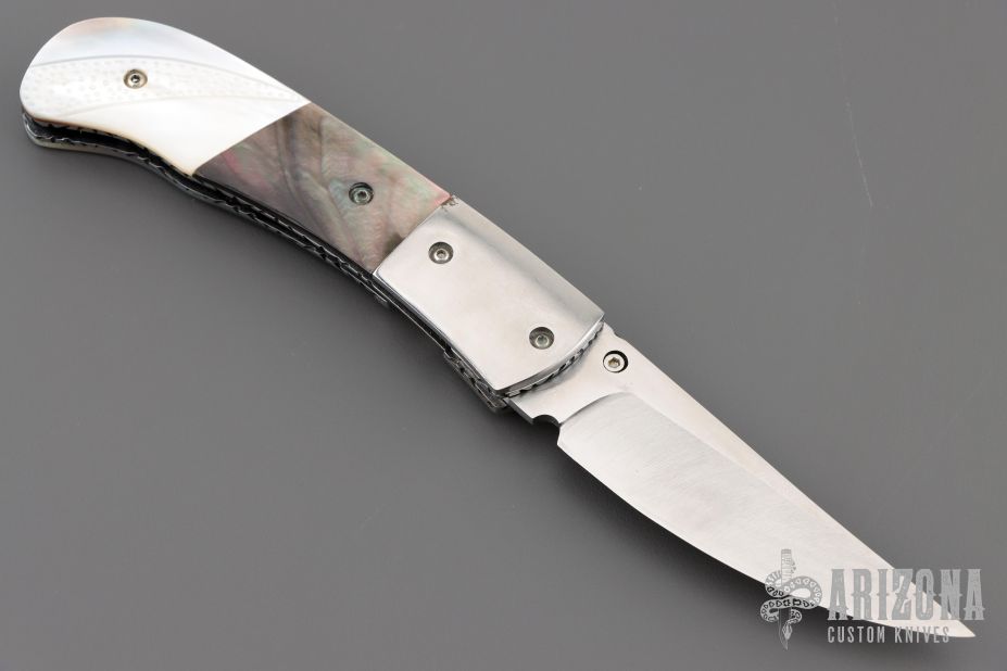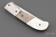 This knife by Master of Knife features a satin finished blade with a single brass thumbstud with clear stone inlay and fileworked blade spine. The handle has stainless steel bolsters, carved mother of pearl and black lip pearl scales, fileworked stainless steel liners and backspacer. Nice blade seating and lockup. Has a couple very light scratches, otherwise excellent condition.