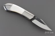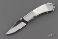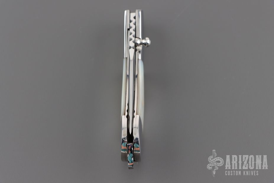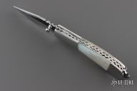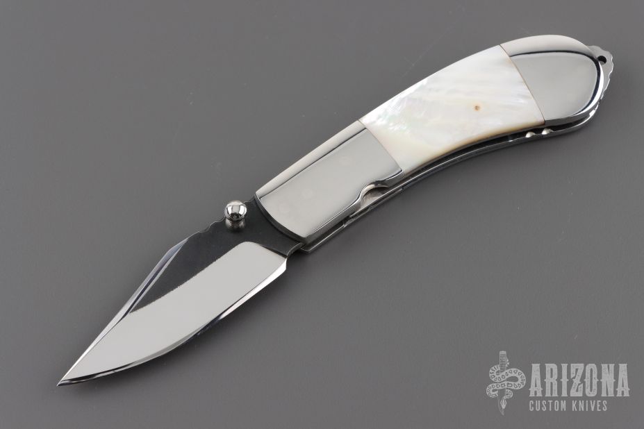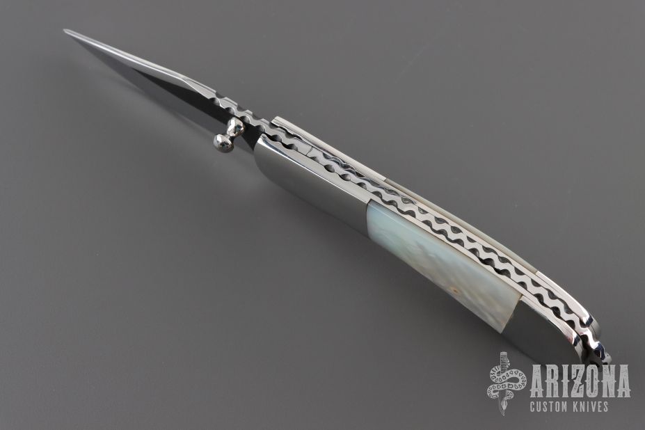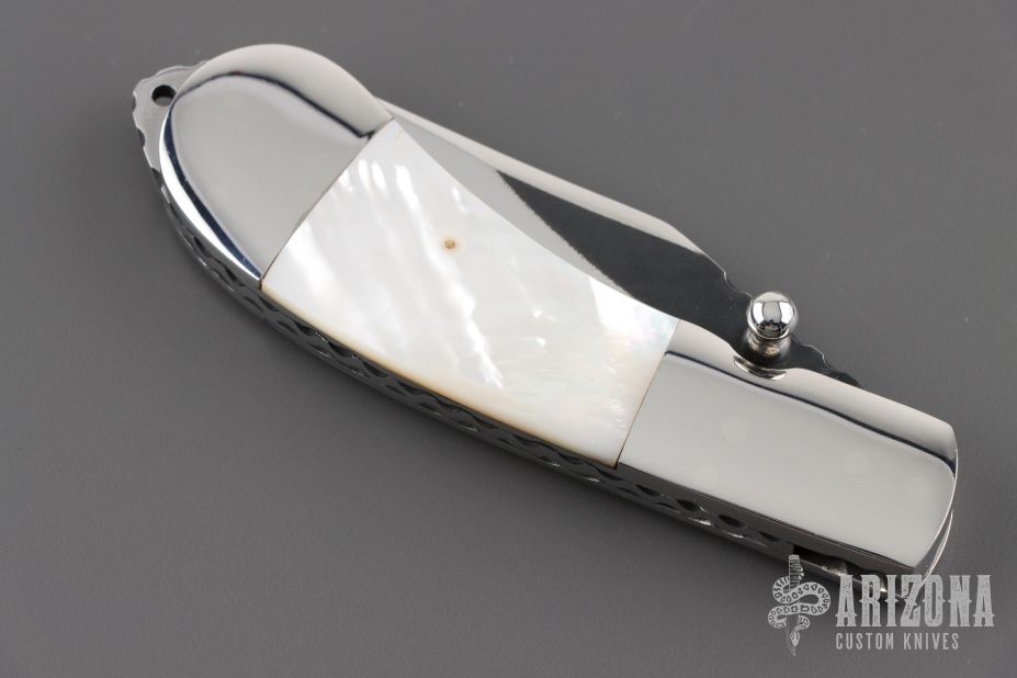This knife by Master of Knife features a mirror finished blade with black flats, a single thumbstud and fileworked blade spine. The handle has stainless steel bolsters, mother of pearl scales, fileworked stainless steel liners and backspacer. Nice blade seating and lockup. Has a couple very light scratches, otherwise excellent condition.