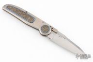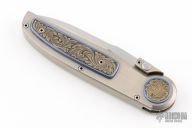This top lock folder features a hand-rubbed satin finish blade and satin titanium frame with scroll worked anodized titanium scales. The scale on one side of the frame acts as a clip while the knife is closed and retracts to be flush with the handle when the knife is opened. Sliding the checker file worked release on the top lock allows the knife to be opened and closed. Smooth action. Perfect blade seating. Excellent work.