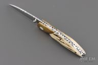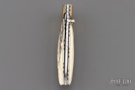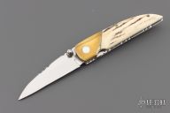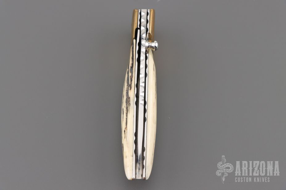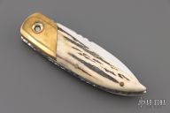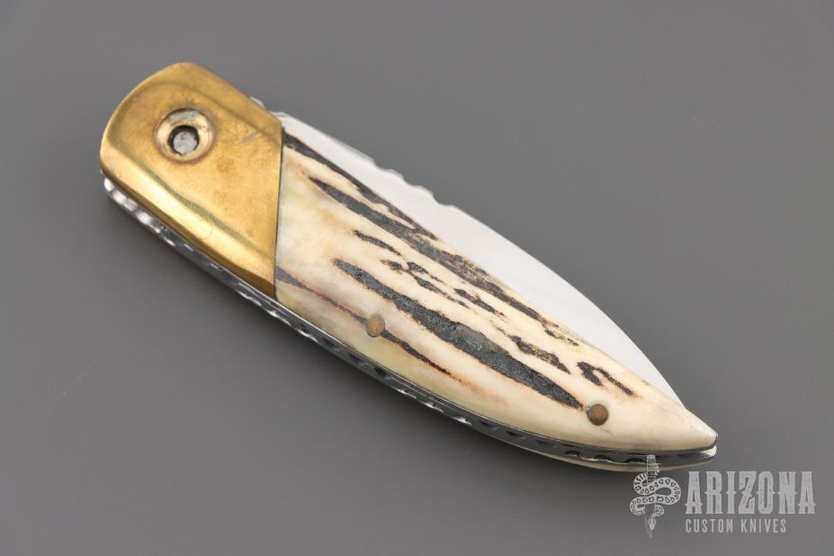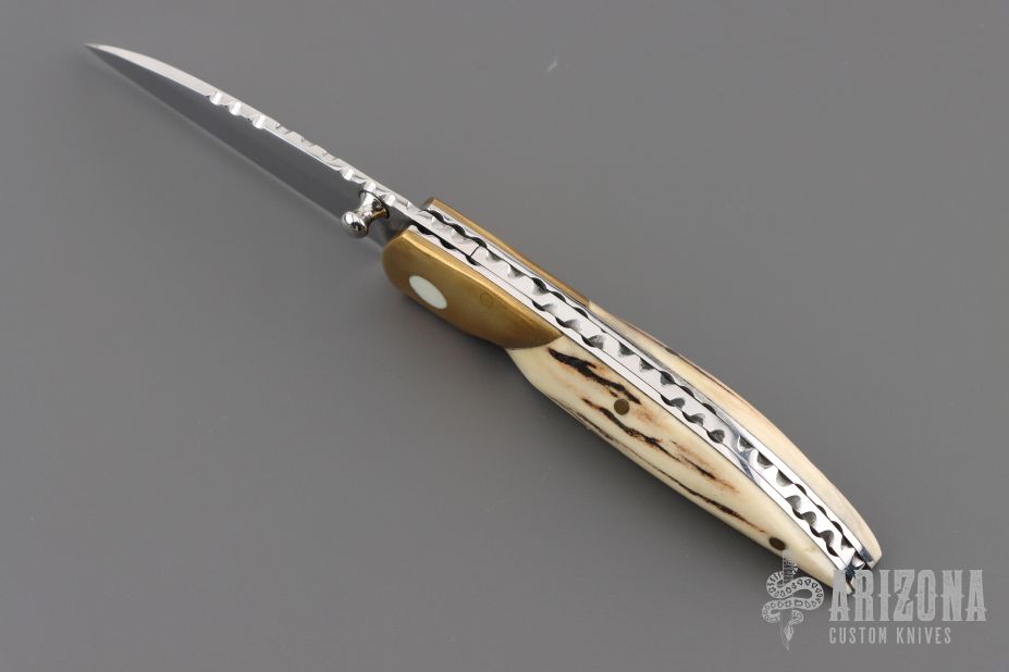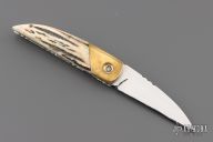 This knife by Master of Knife features a mirror finished blade with a single thumbstud and fileworked blade spine. The handle has brass bolsters with bone inlays (one of which is missing), stag scales, fileworked stainless steel liners and backspacer. Nice detent, blade seating and lockup. Has a couple very light scratches, otherwise good condition.