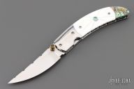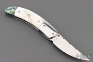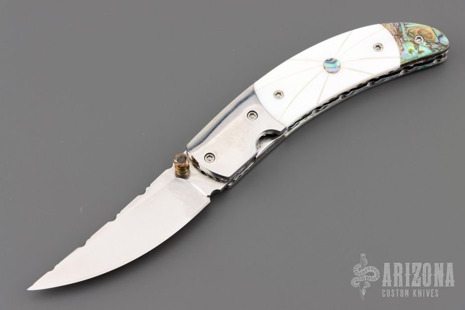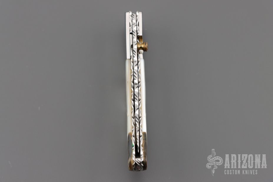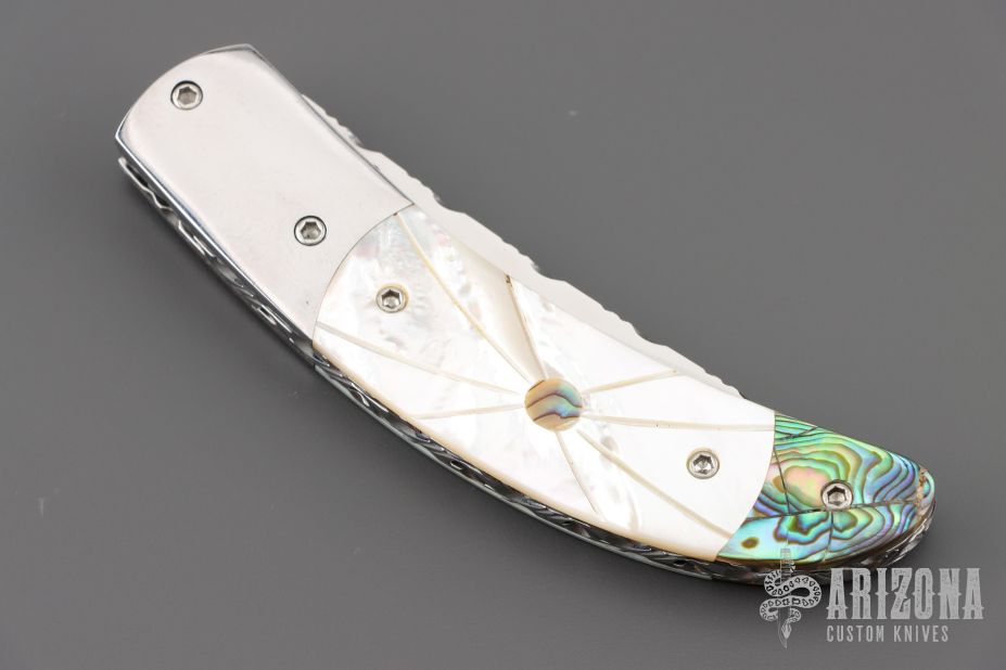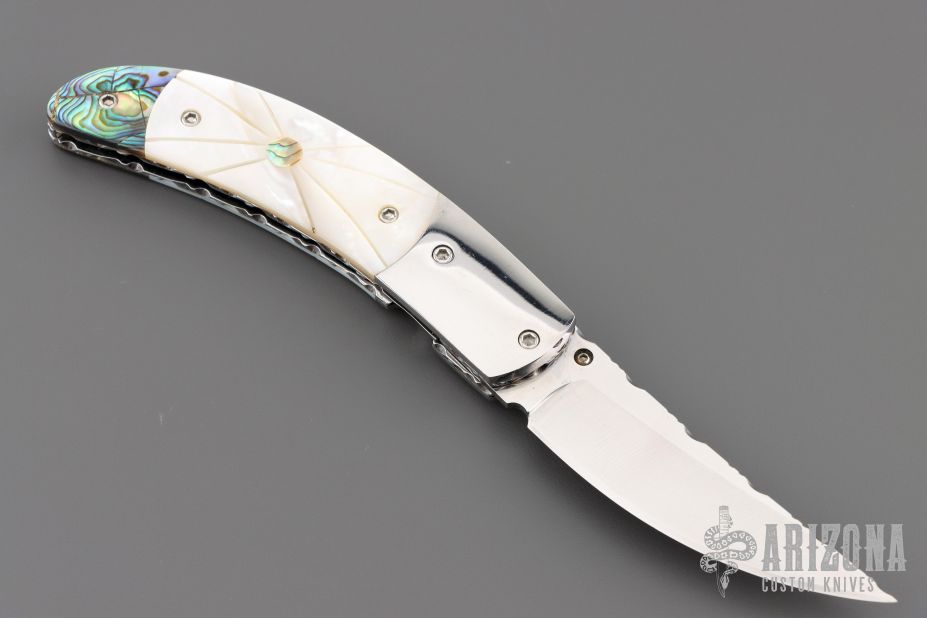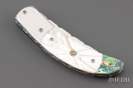 This knife by Master of Knife features a satin finished blade with a single brass thumbstud with black lip pearl inlay and fileworked blade spine. The handle has stainless steel bolsters, abalone and carved mother of pearl scales, fileworked stainless steel liners and backspacer. Nice detent, blade seating and lockup. Has a couple very light scratches, otherwise excellent condition.
