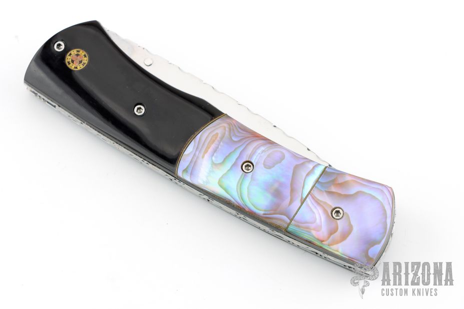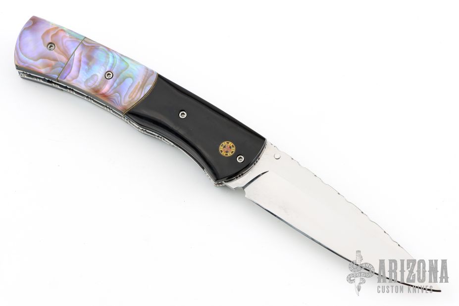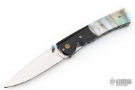 This knife by Master of Knife features a mirror polished blade with a single thumbstud with turquoise inlay and fileworked blade spine. The handle has buffalo horn bolsters, abalone scales, fileworked stainless steel liners and backspacer. Nice detent, lockup and blade seating. Has a couple very light scratches, otherwise excellent condition.
