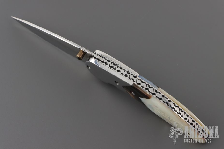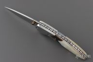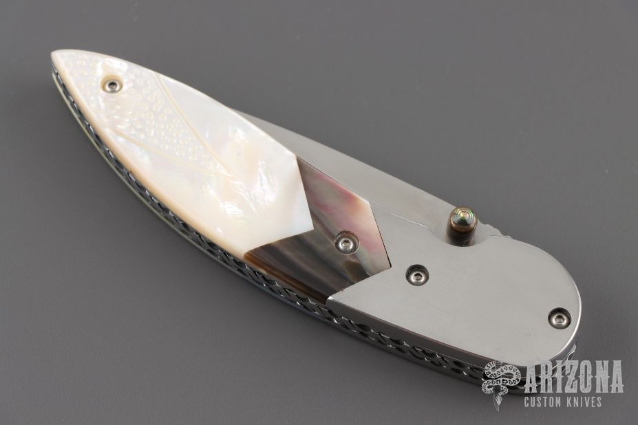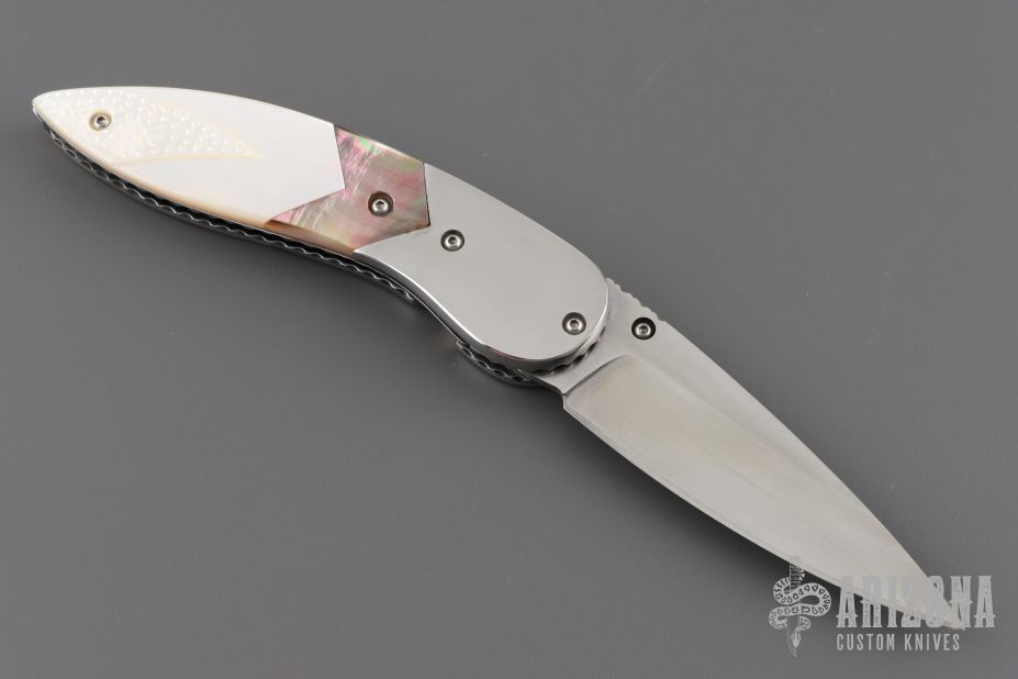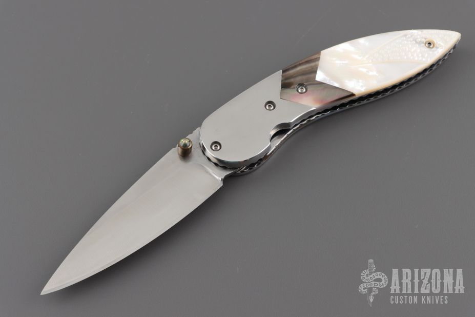This knife by Master of Knife features a satin finished blade with a single brass thumbstud with black lip pearl inlay and fileworked blade spine. The handle has stainless steel bolsters, carved mother of pearl and black lip pearl scales, fileworked stainless steel liners and backspacer. Nice detent and blade seating, but the lock slips. Has a couple very light scratches, otherwise excellent condition.